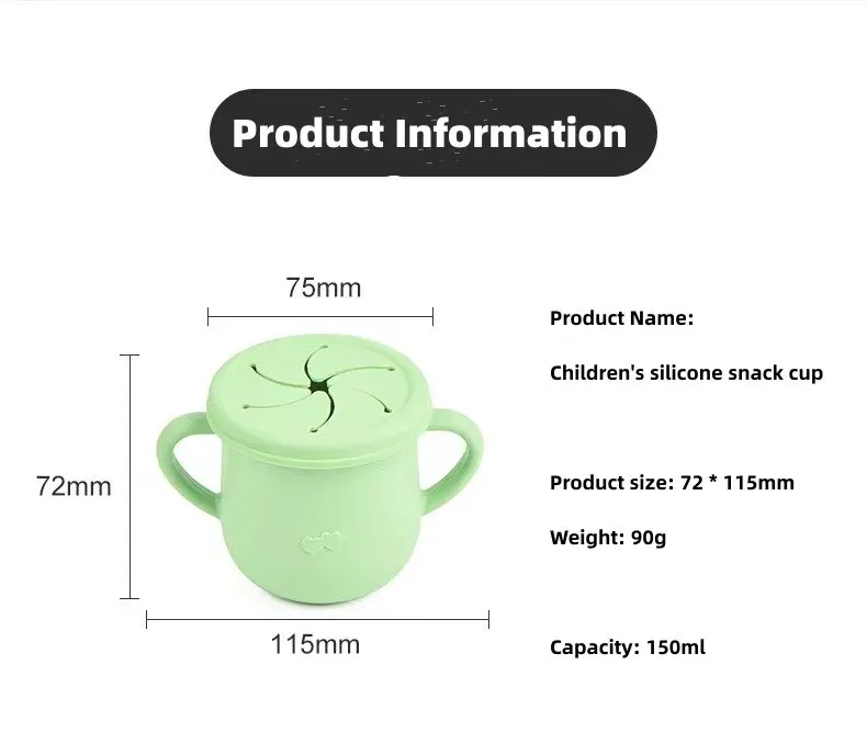 • Large Volume :With a capacity of 150ml, this baby snack cup provides ample space for your baby’s favorite snacks or beverages. It’s ideal for keeping your baby hydrated and satisfied.