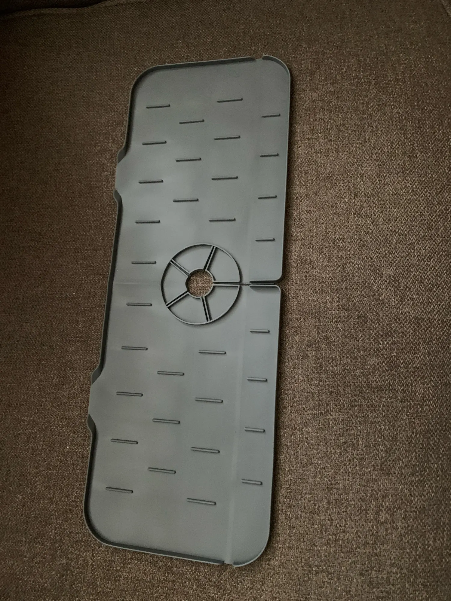 This silicone mat is exactly what i needed for my kitchen sink faucet. It was very easy to remove the center sections so that it would fit securely around the faucet. And, it is large enough to place a sponge and bar of soap on either side. In addition, water simply pours out from the front area.
