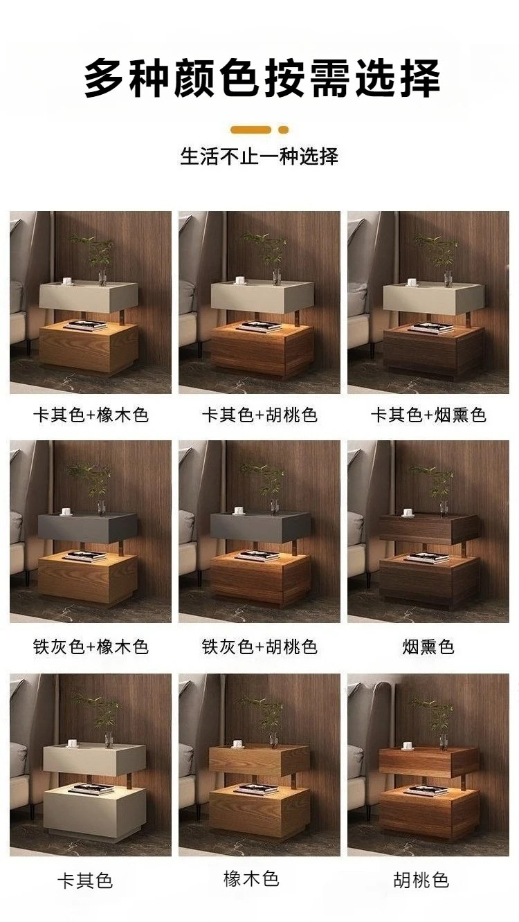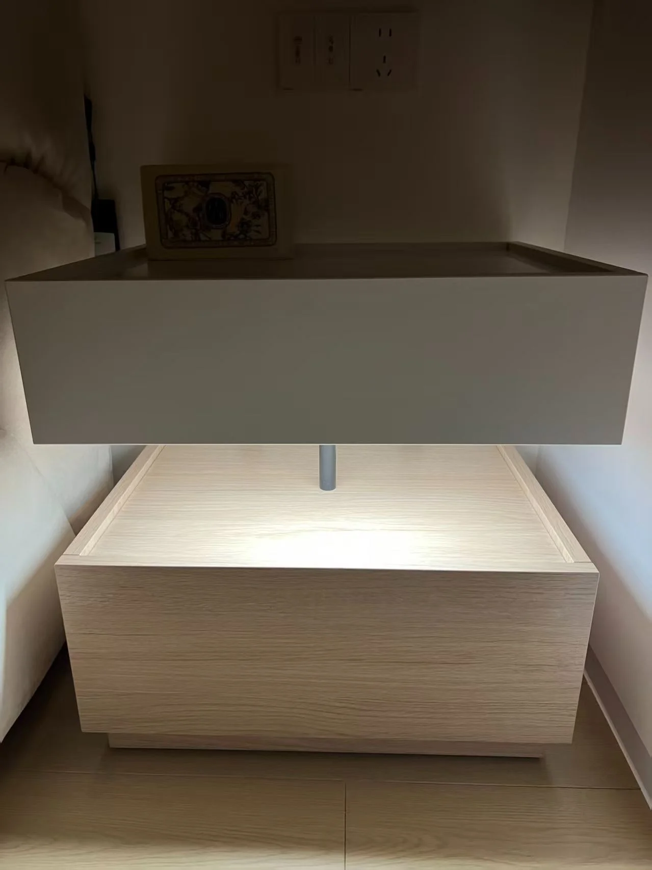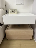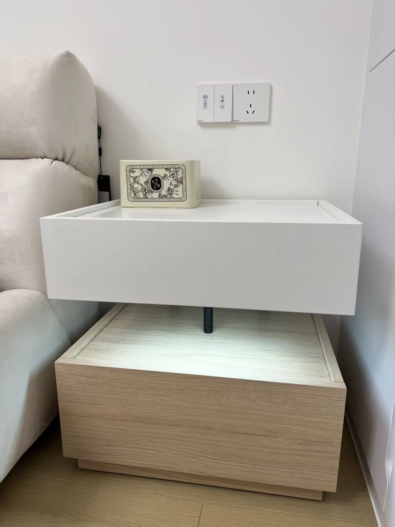 The bedside table is very beautiful, made entirely of solid wood, there is hardly any smell, and it matches my cream-colored decor perfectly.