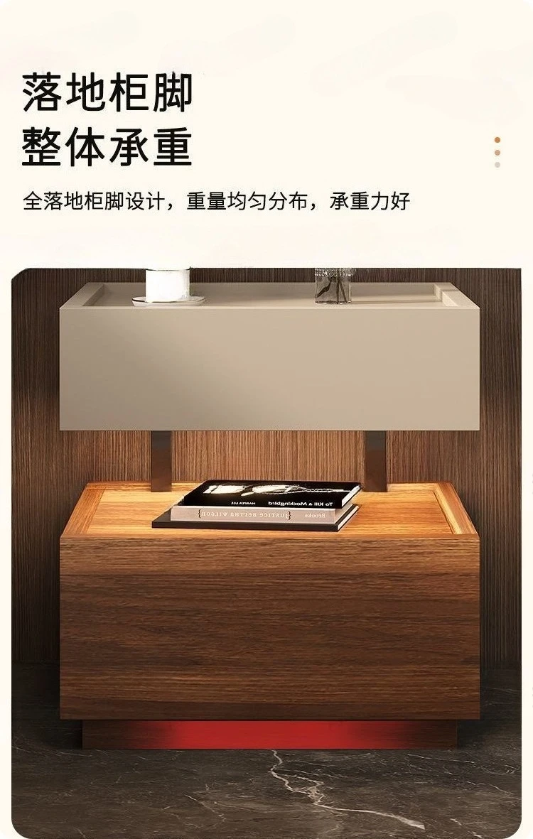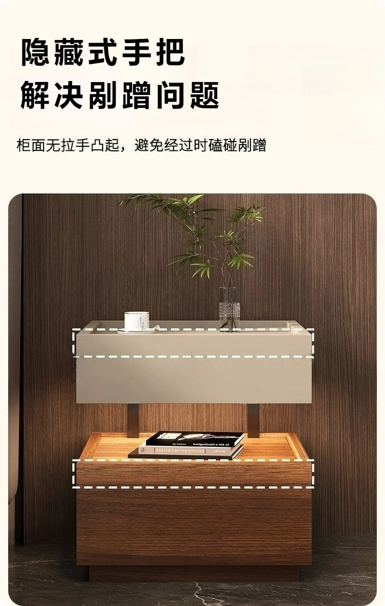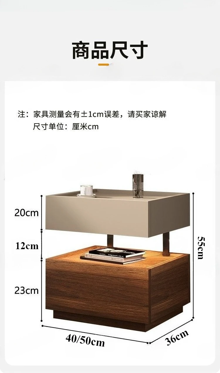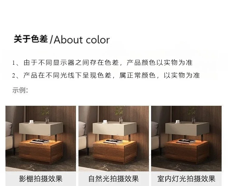 The bedside table is very beautiful, made entirely of solid wood, there is hardly any smell, and it matches my cream-colored decor perfectly.