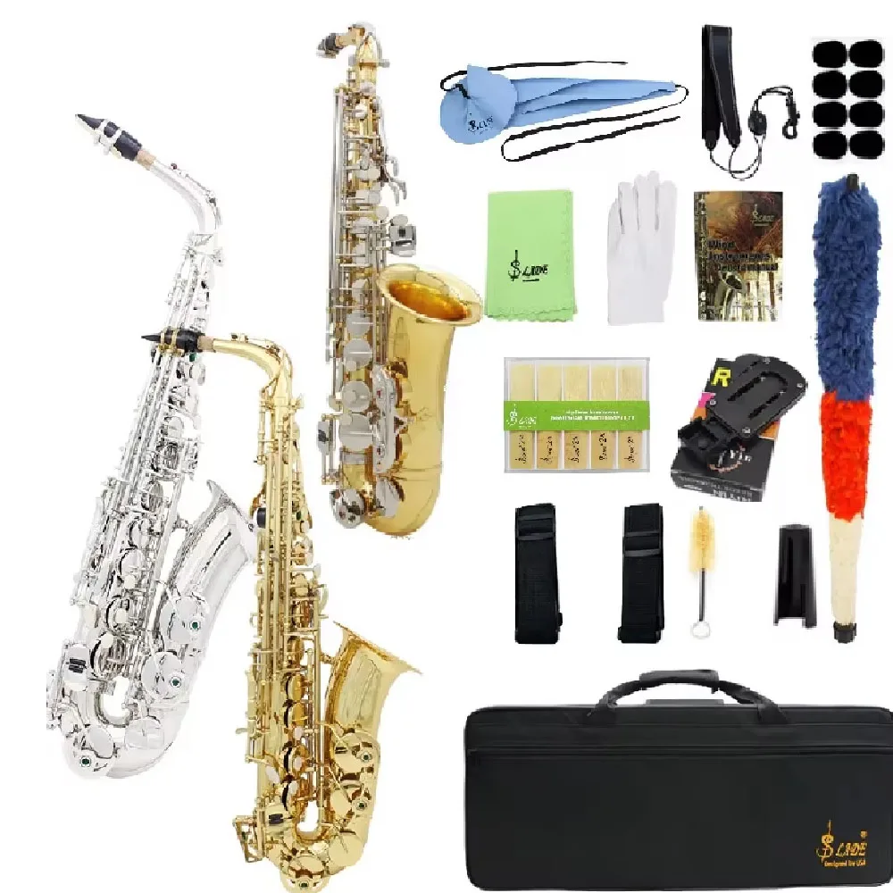 SLADE Professional Eb Alto Saxophone Gold Silver E Flat Tonality Sax Brass Body Carved White Shell Button Sax with Accessories Set