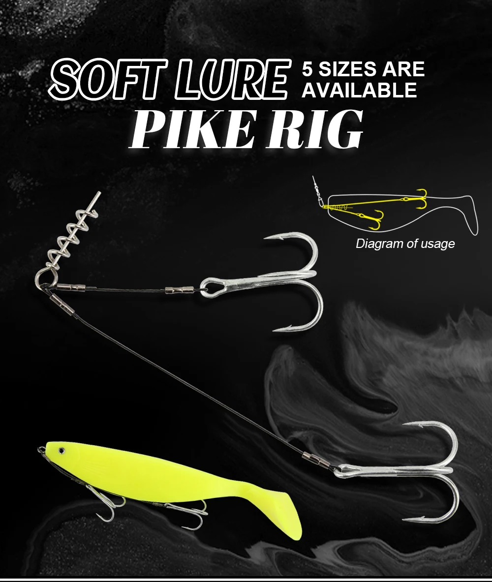 The reliable Pike Rig combines two super sharp treble hook, each with a different length of lead plus a coil spring, corkscrew type, which is fixed in the head of silicone quickly, easily and safely.