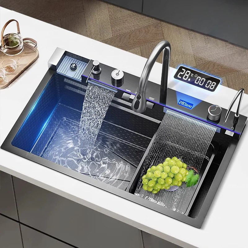 Stainless Steel Waterfall Kitchen Sink Extra Large Single Bowl Digital Display Multifunctional Dishwashing sinks
