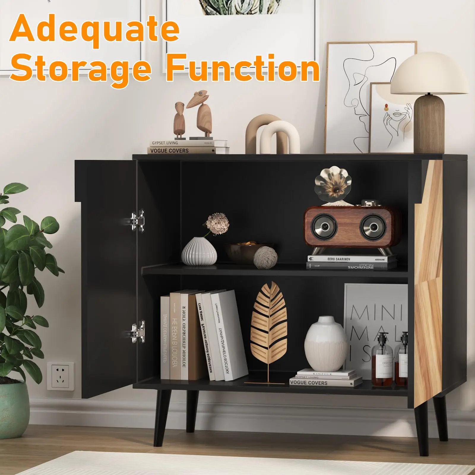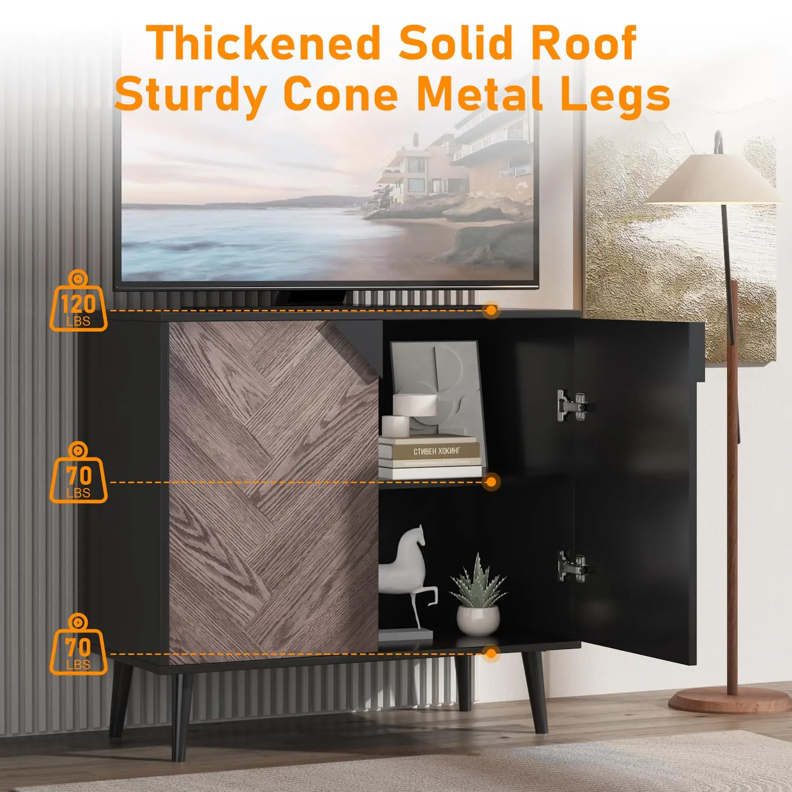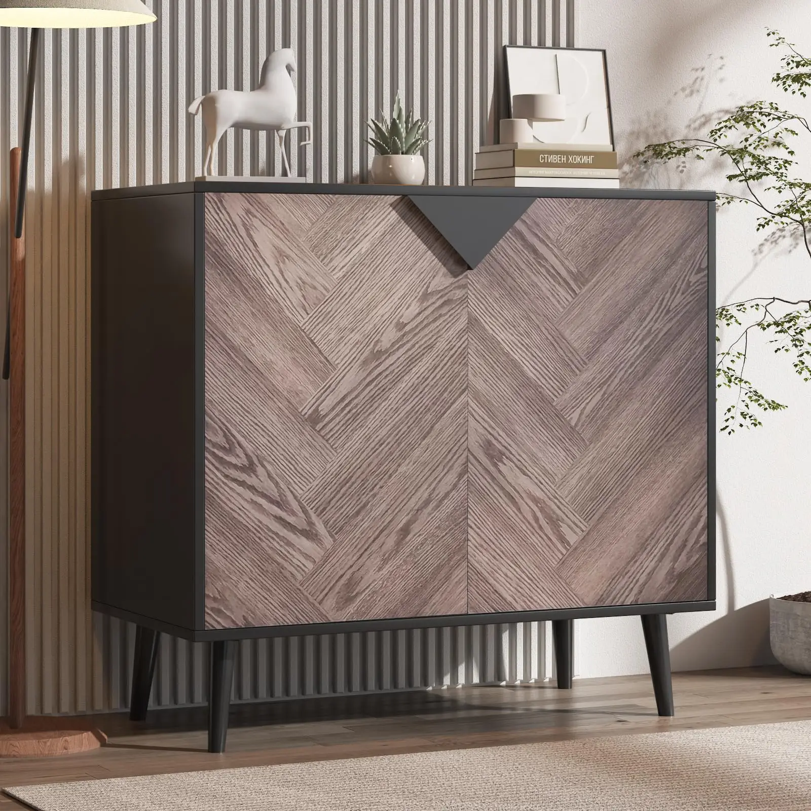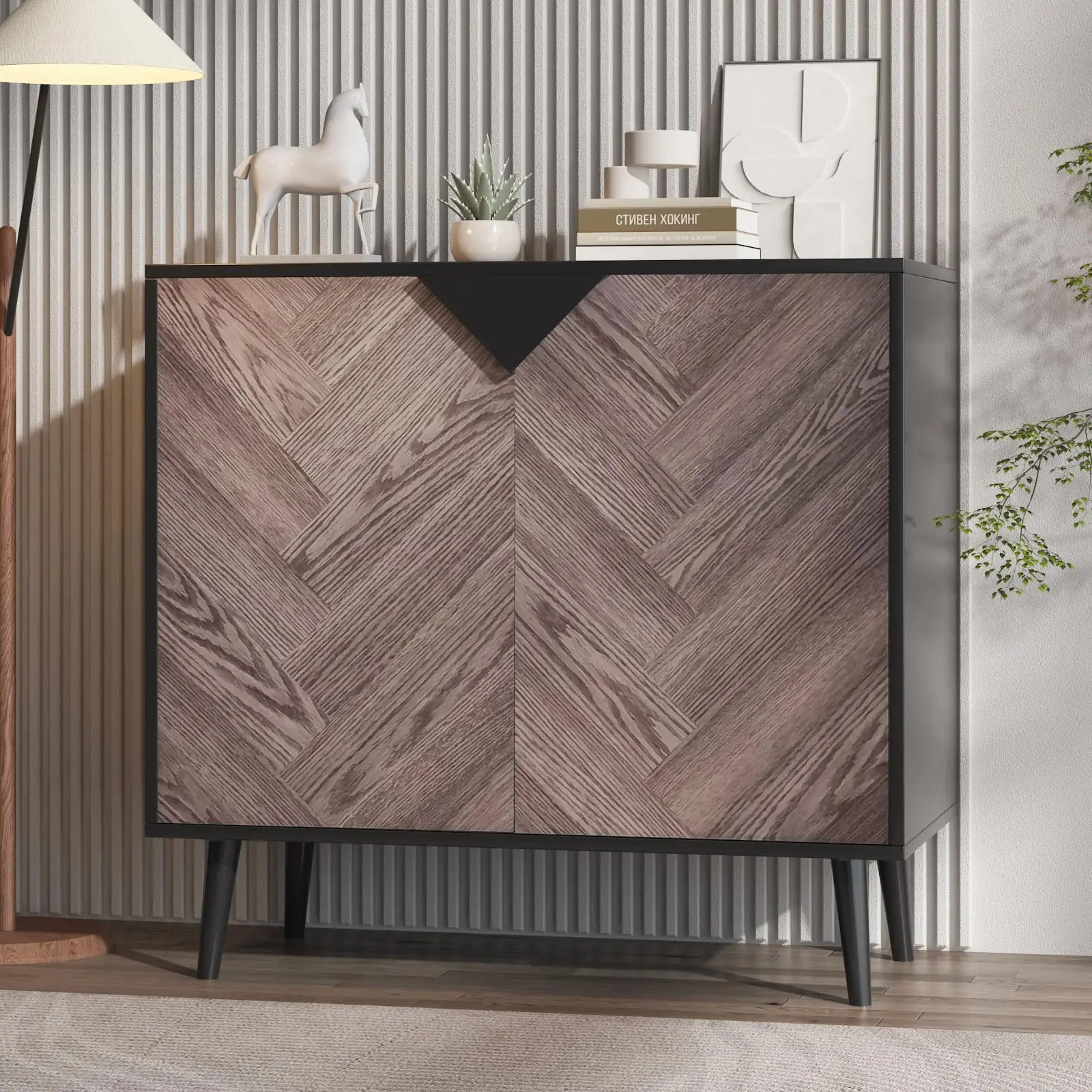 1. Modern Woodgrain Sideboard: Features a stylish wood finish and sleek black accents, blending timeless elegance with contemporary design for any dining or living space.