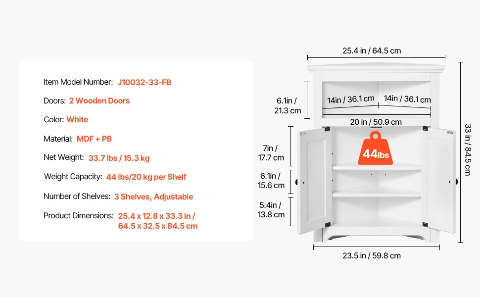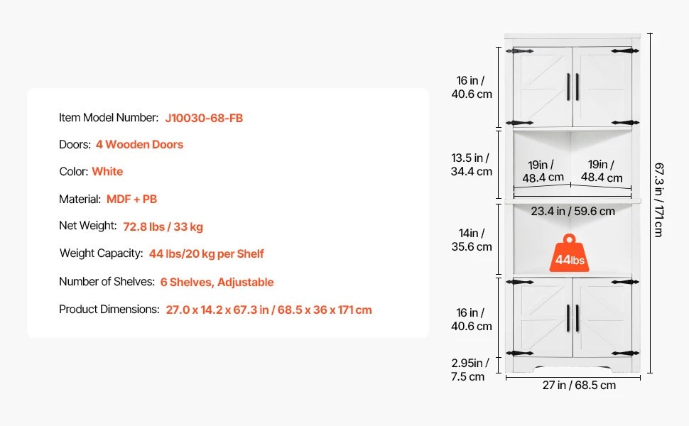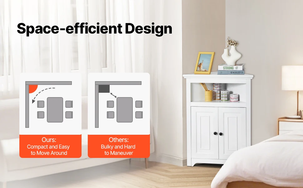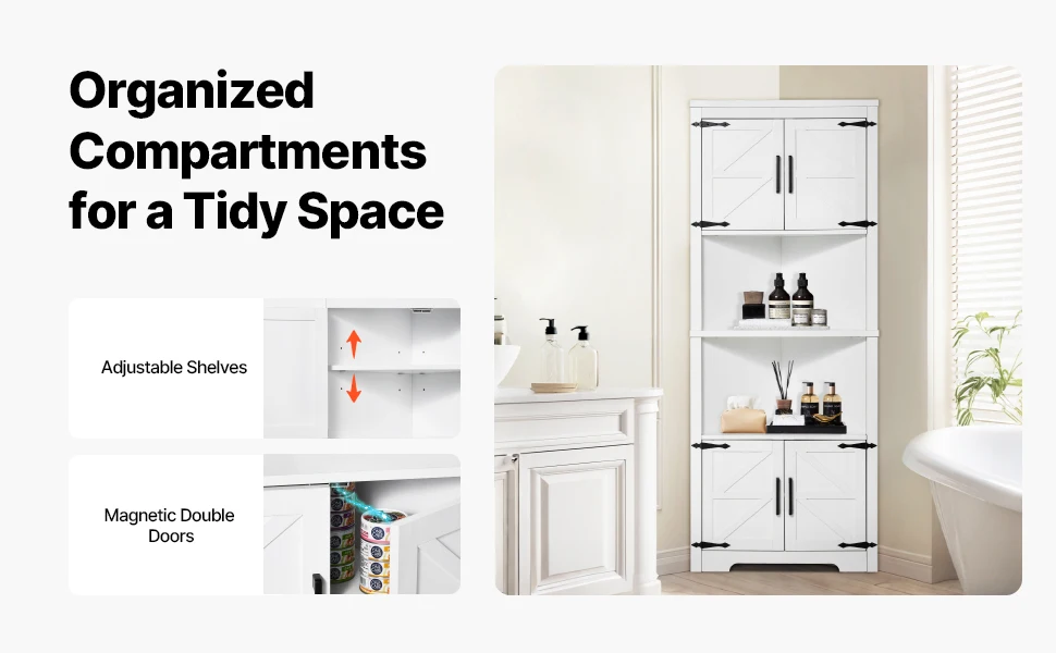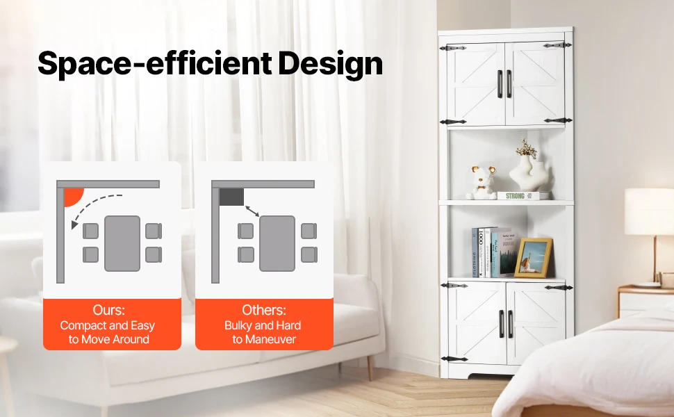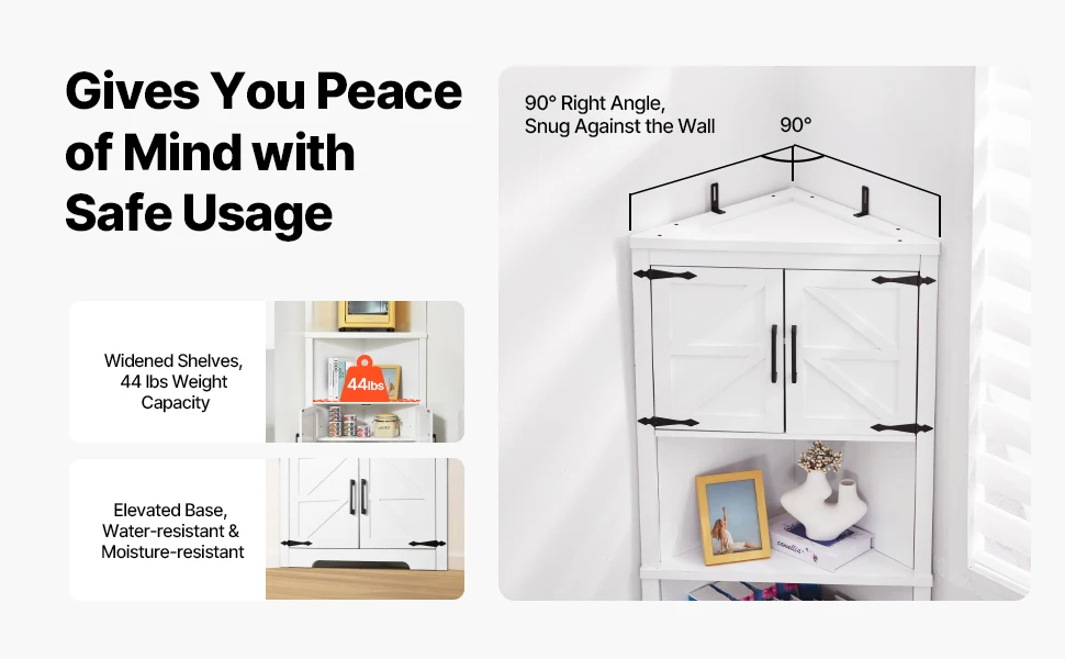 Hassle-Free Setup: All the parts and instructions you need are included, making assembly quick and simple. Grab a friend, and you can have your corner cabinet storage ready in about 60 minutes. Heads up: lighting and screen settings might make the product look slightly different in photos compared to real life. And, for extra peace of mind, we’ve added a corner cabinet with doors for secure storage.
