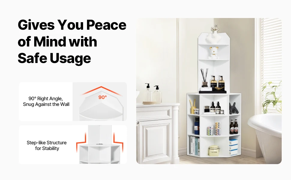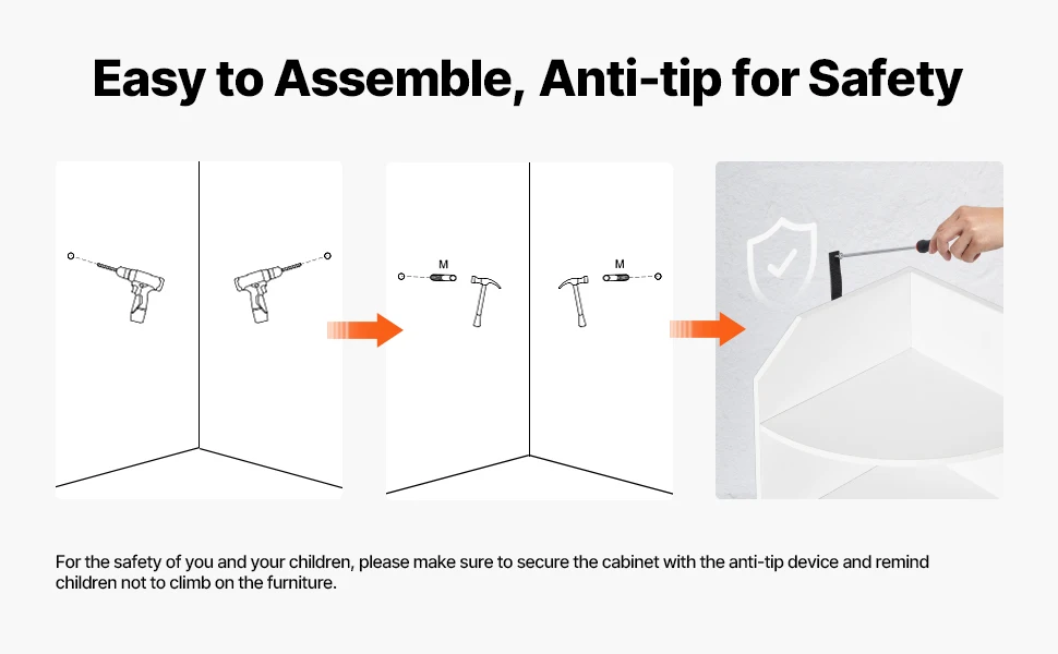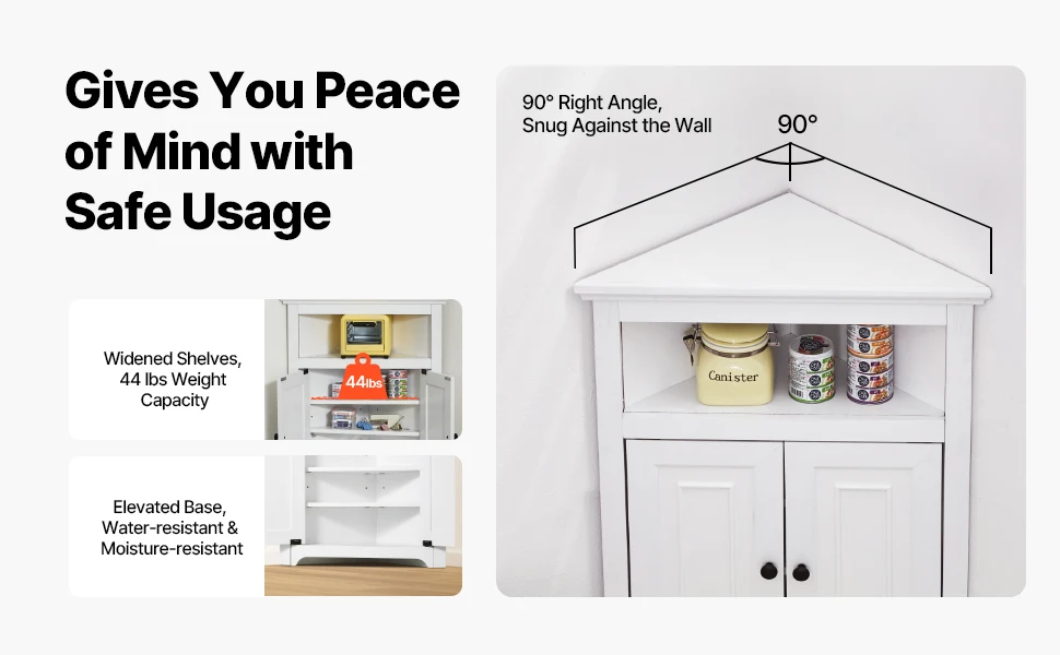 Stable & Secure Structure: Made from thickened particle board and featuring a trapezoidal design for added stability, this tall corner cabinet can hold up to 15 lbs (6.8 kg) per shelf, safely storing items like a small toaster oven. Plus, we’ve included a tip-over prevention device—be sure to install it for added security.