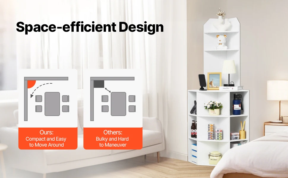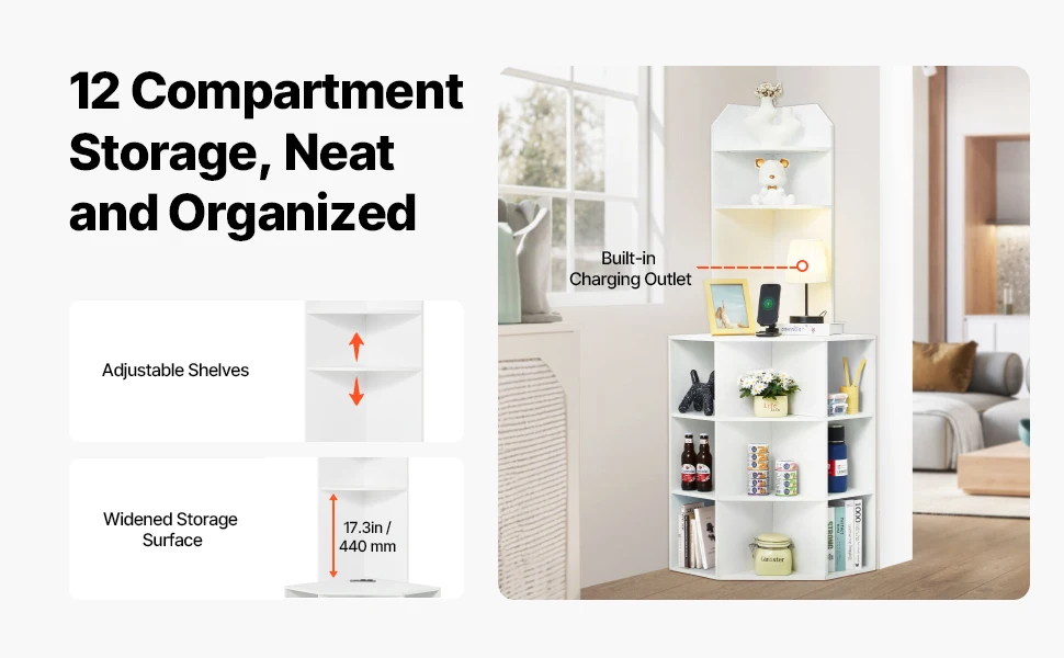 12-Compartment Organized Storage: Offering corner cabinet storage with 12 compartments, this piece keeps your headphones, books, decorative items, and more neatly organized. With adjustable shelves (0-55mm), you can easily customize the space to store dishes, bags, photo albums, and other essentials.