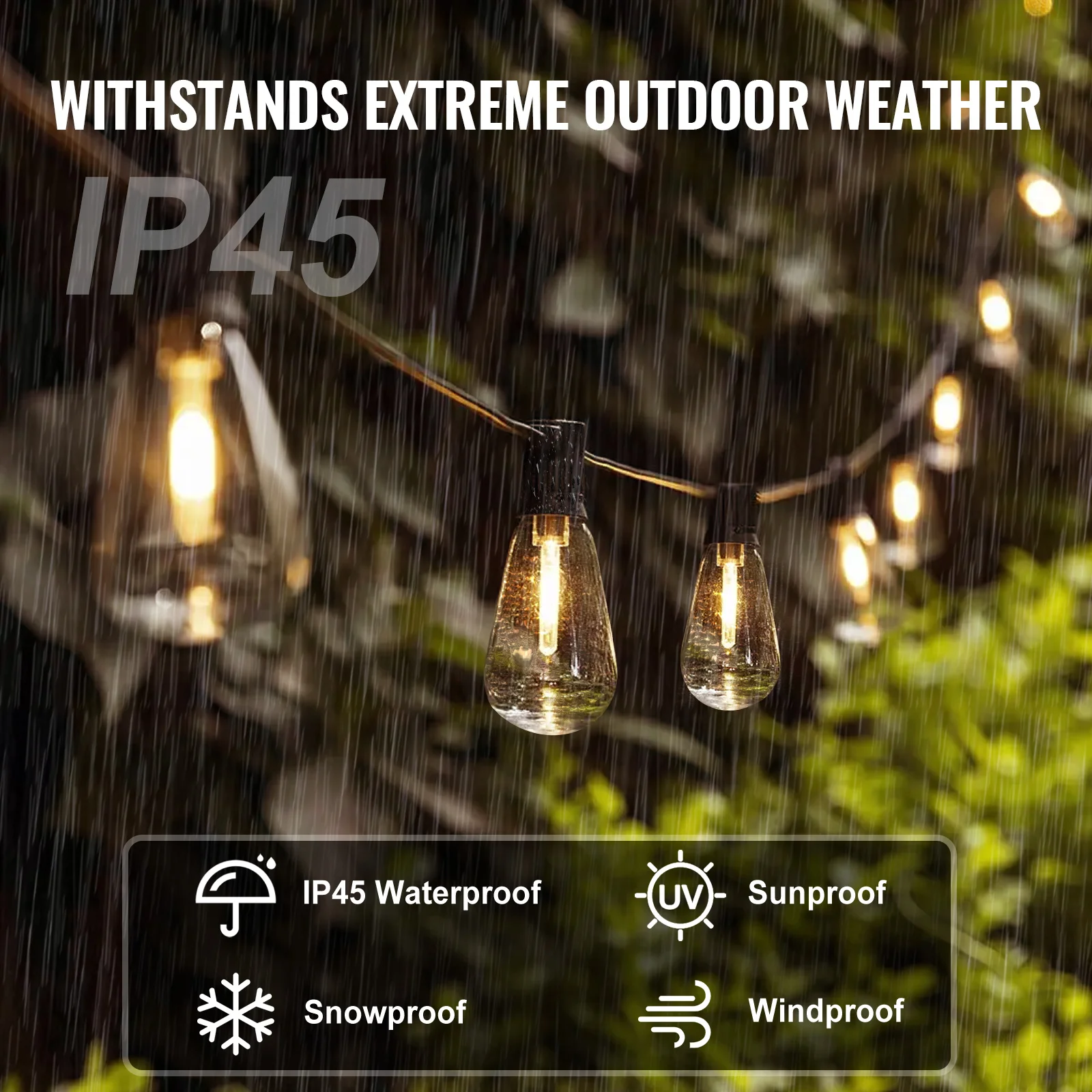 Transform your outdoor space with our 50 ft (15.24 m) LED string lights, featuring 15 bulbs that emit a warm 2700K light. With 31 LM brightness per bulb, these lights are ideal for patios, gardens, porches, and more. Built to withstand the elements, they are FCC-certified and rated IP45 waterproof, ensuring reliable performance in rain, snow, or wind.