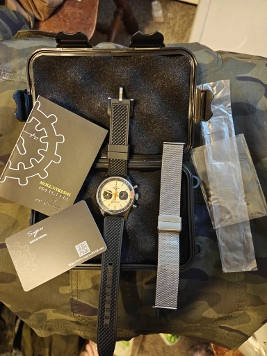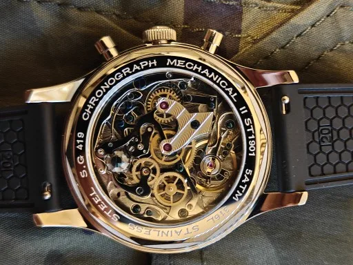 Beautiful mechanical chronograph! The watch arrived in a hard protective case, with extra strap, tools, snd documentation — very professional. The dial is elegant, retro-inspired, and the st1901 movement looks stunning through the exhibition caseback.