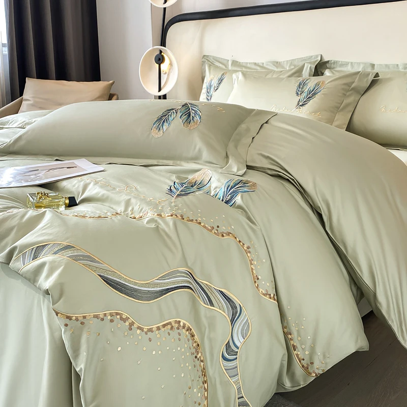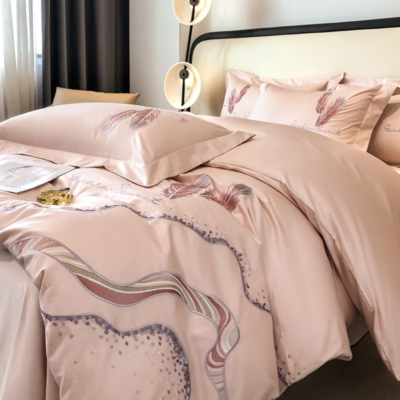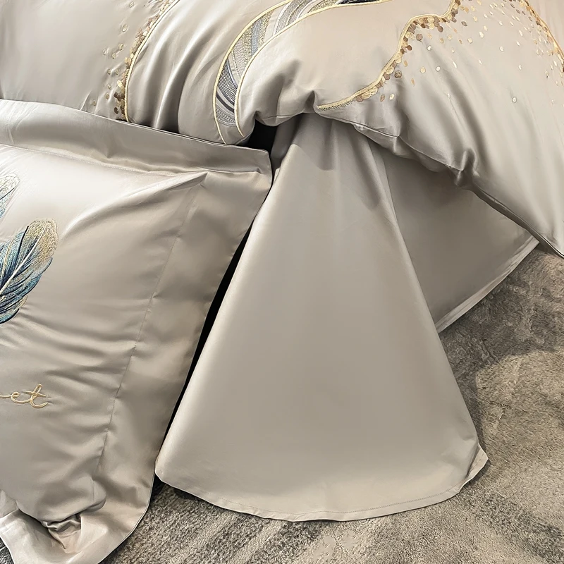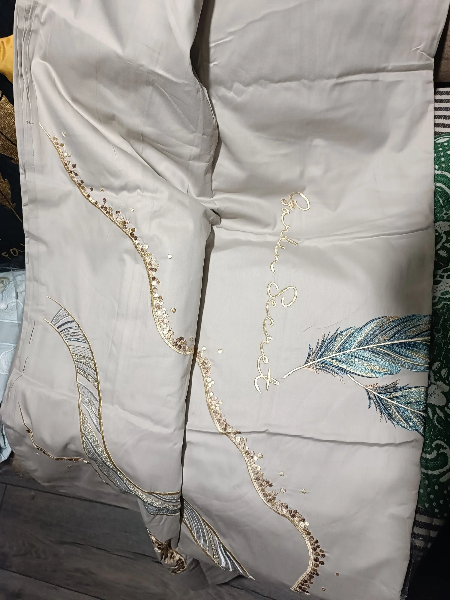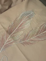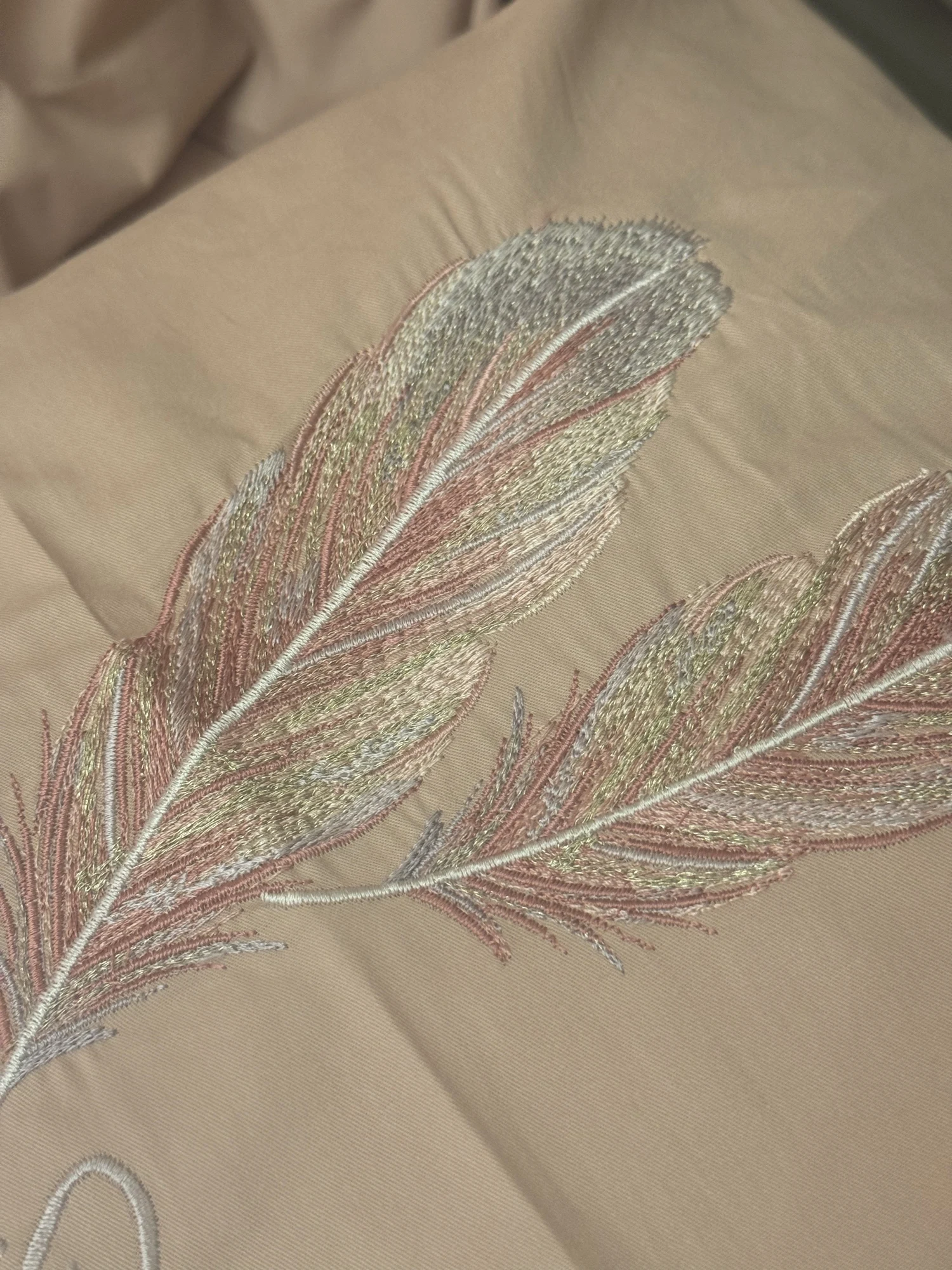 The feathers are very beautifully embroidered and shimmer in the light, the fabric is normal, this manufacturer has better fabric composition sets.