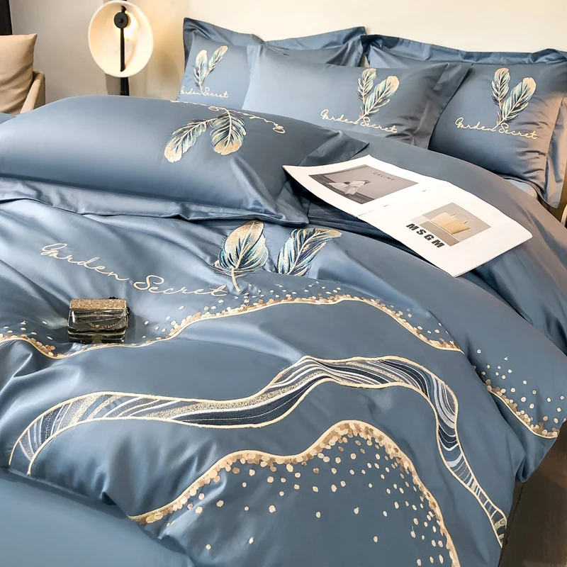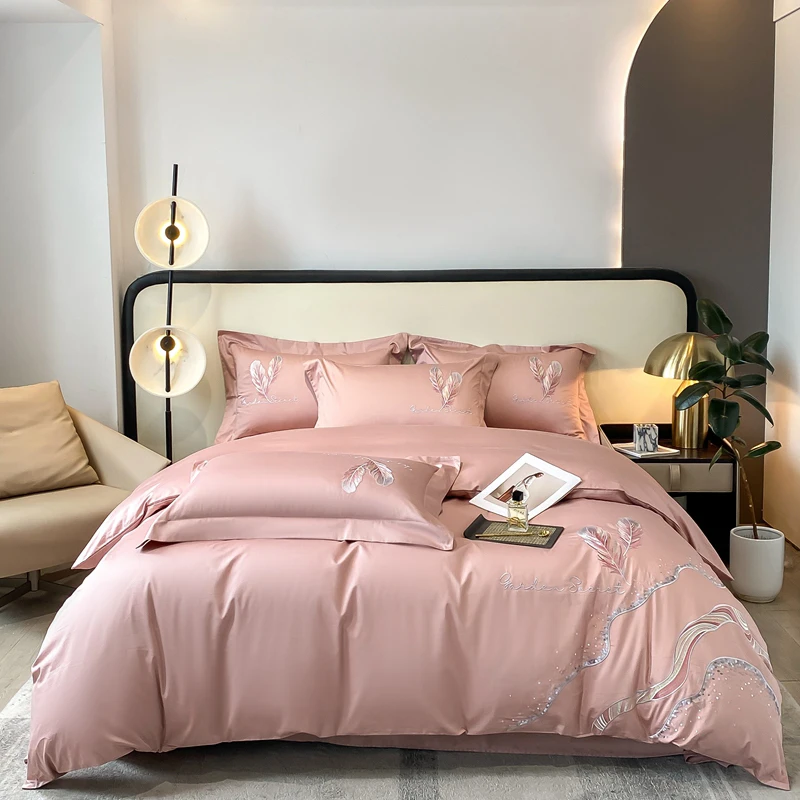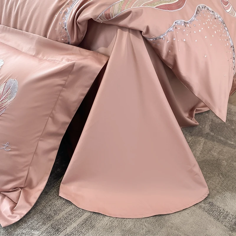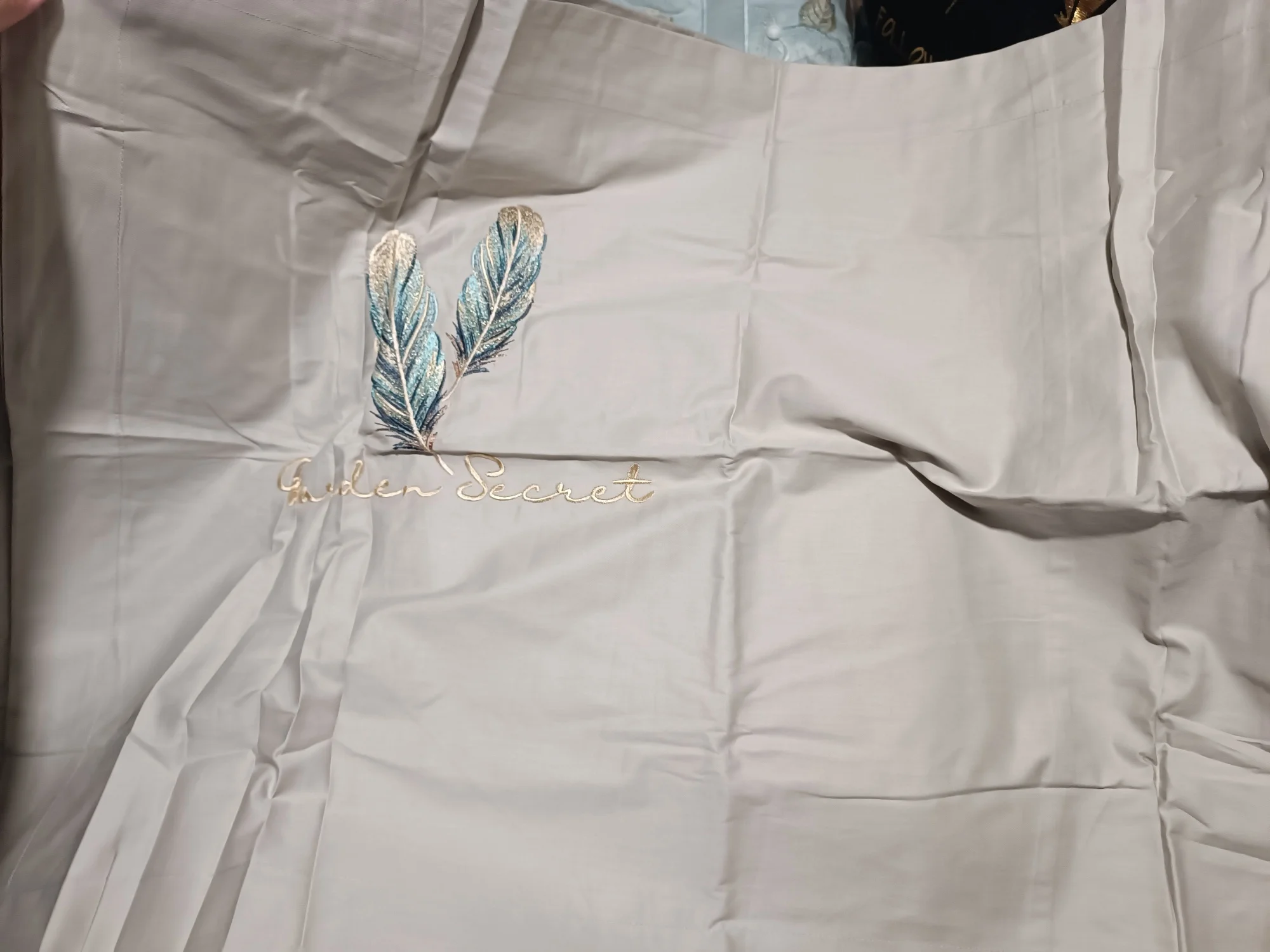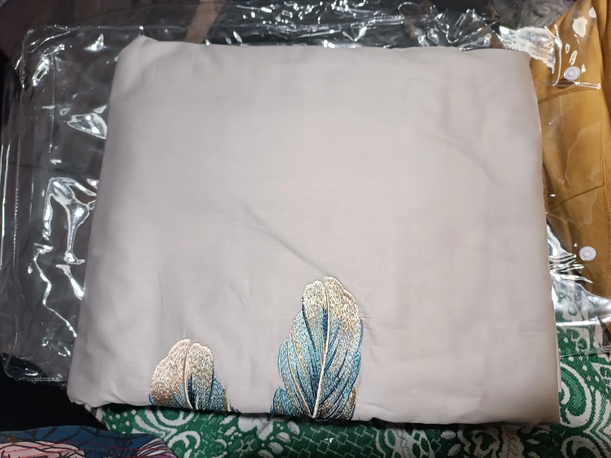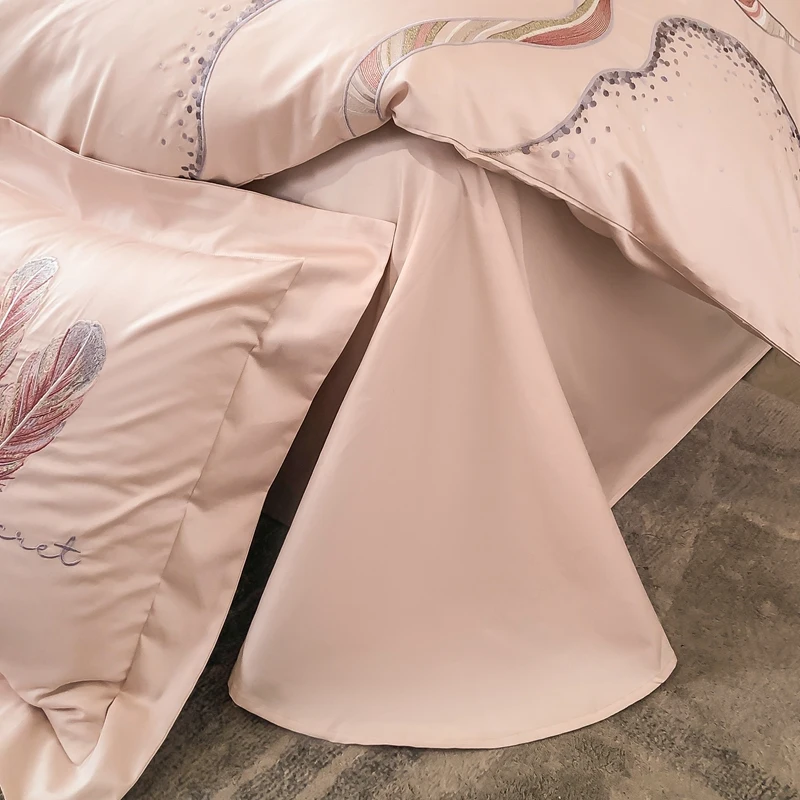 The feathers are very beautifully embroidered and shimmer in the light, the fabric is normal, this manufacturer has better fabric composition sets.