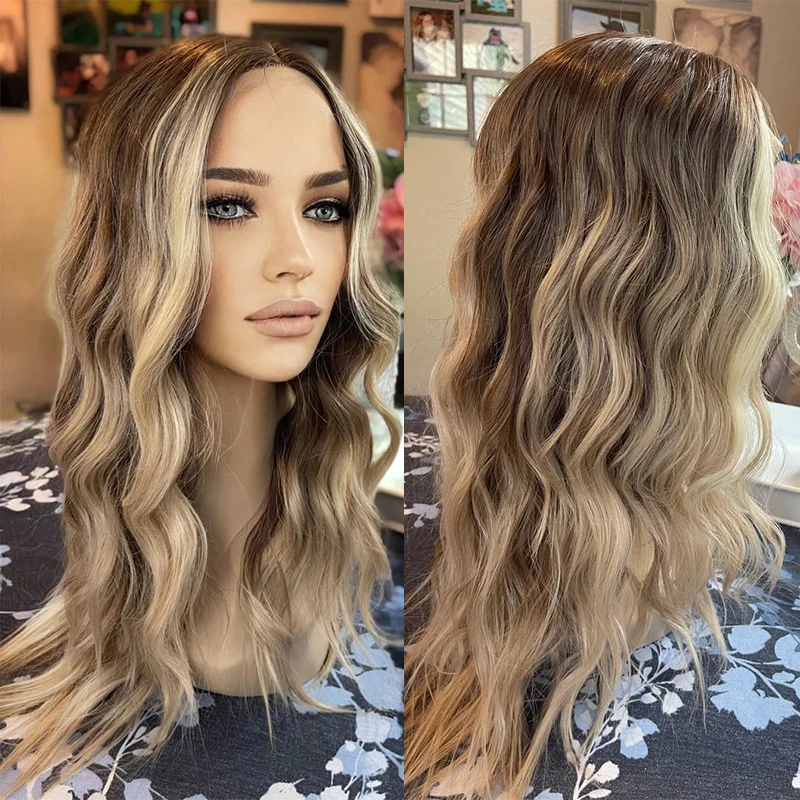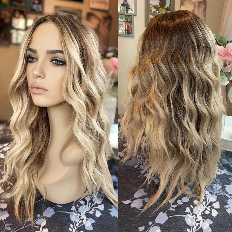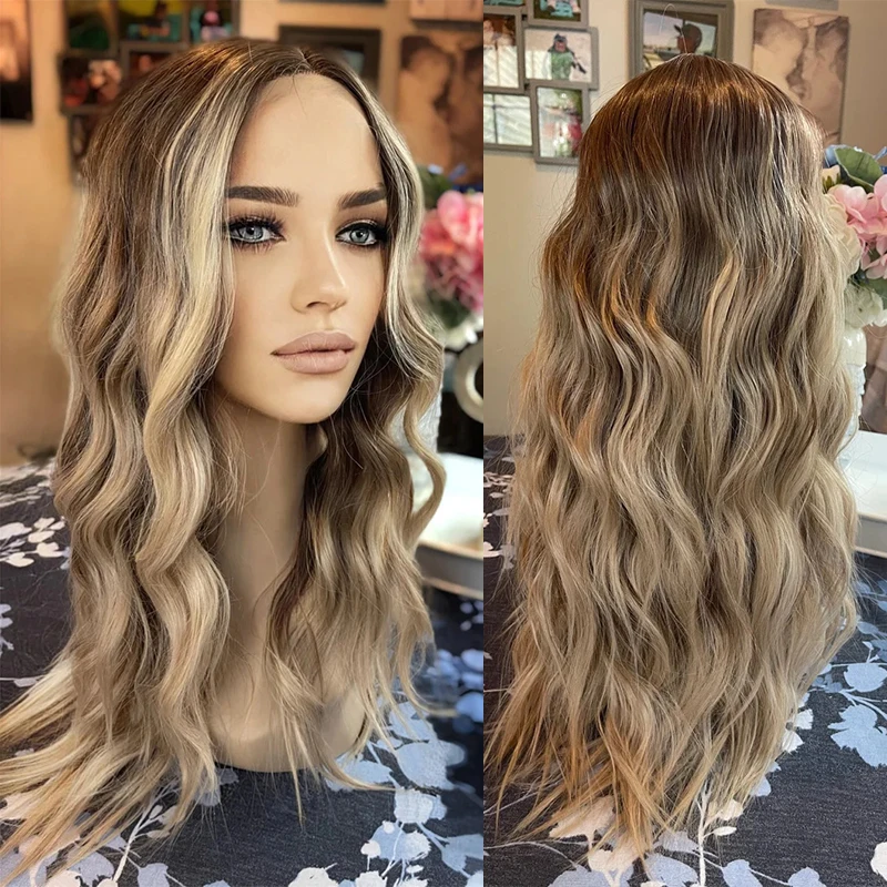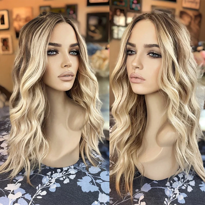 Synthetic Premium Fiber Custom Lace Front Wig Ash Blonde Ombre Dark Roots Preplucked Soft Body Wave Wigs for Women Daily Wear