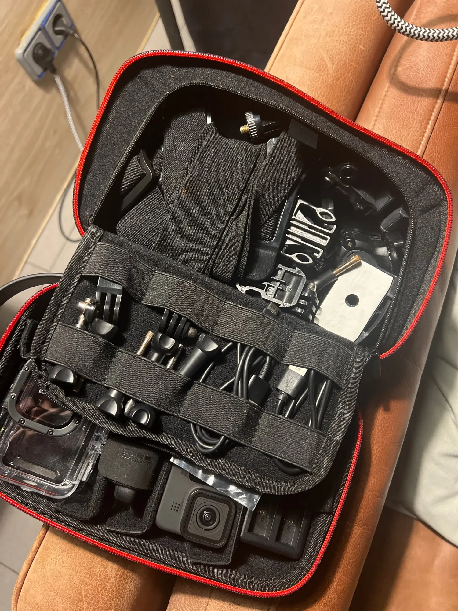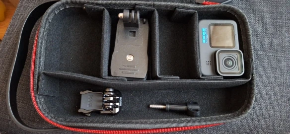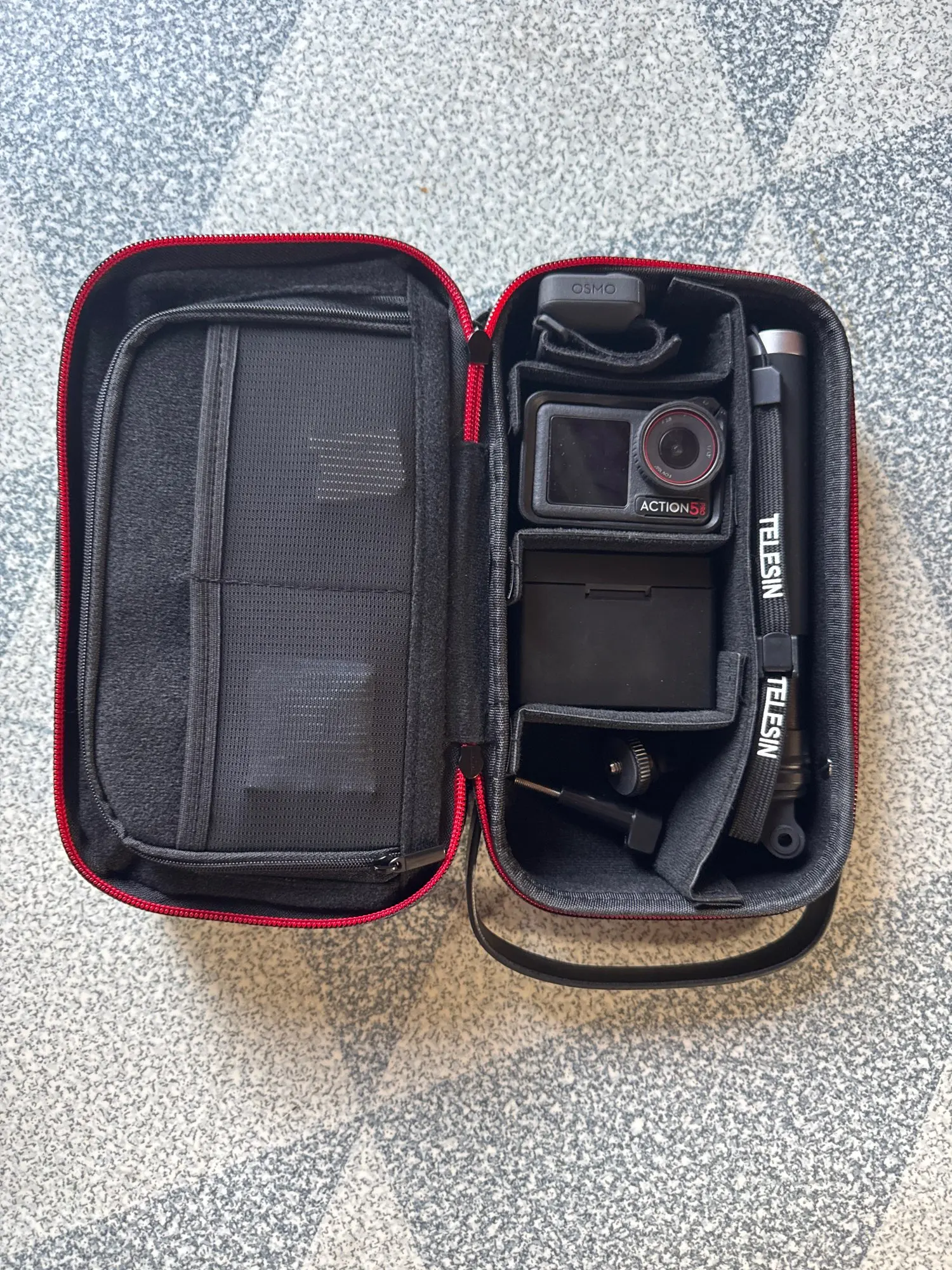 I’m using a dji ozmo action 5 pro. I bought the product while thinking about a protective pouch that can store and carry various accessories, selfie sticks, and battery packs. I’m so satisfied with the result! There is plenty of storage space and excellent protection performance for equipment. Above all, the design of the product is very good and utilization is good. One disadvantage is that the product smells a lot of chemical chemicals. This will disappear after drying or washing for a certain period of time, but it seems to have to be improved to enhance the image of the brand.