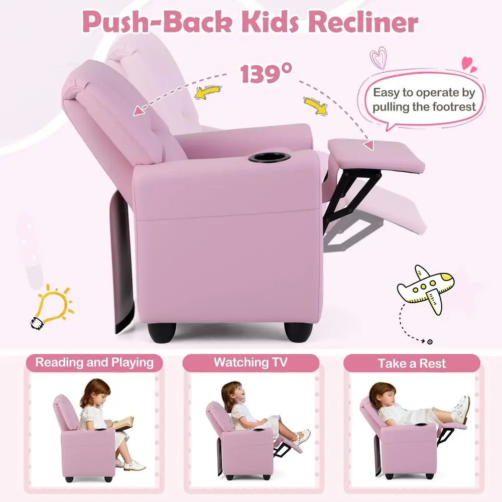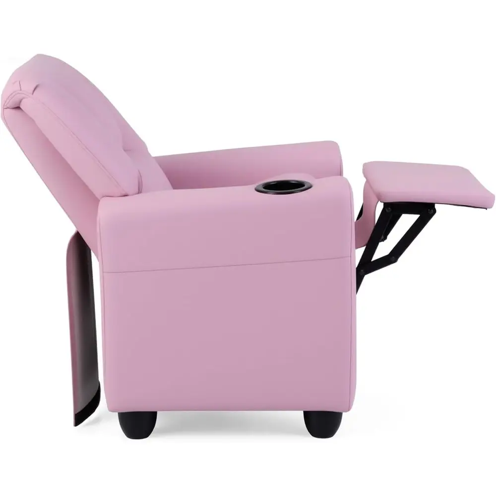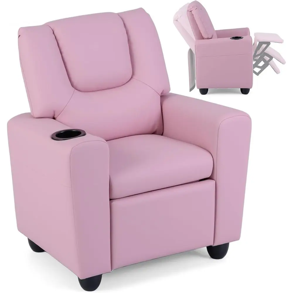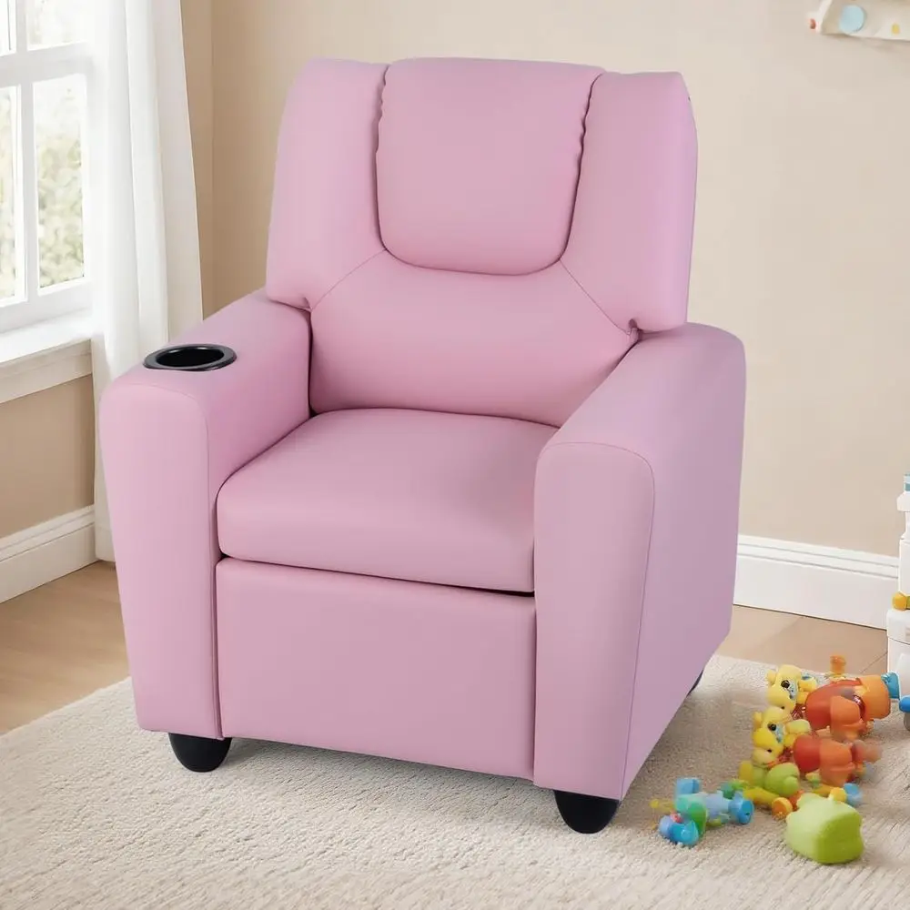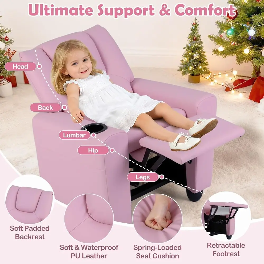 Toddler Recliner Chair with Cup Holder, Adjustable Lounger for Kids, Pink Ergonomic Furniture for Ages 3+