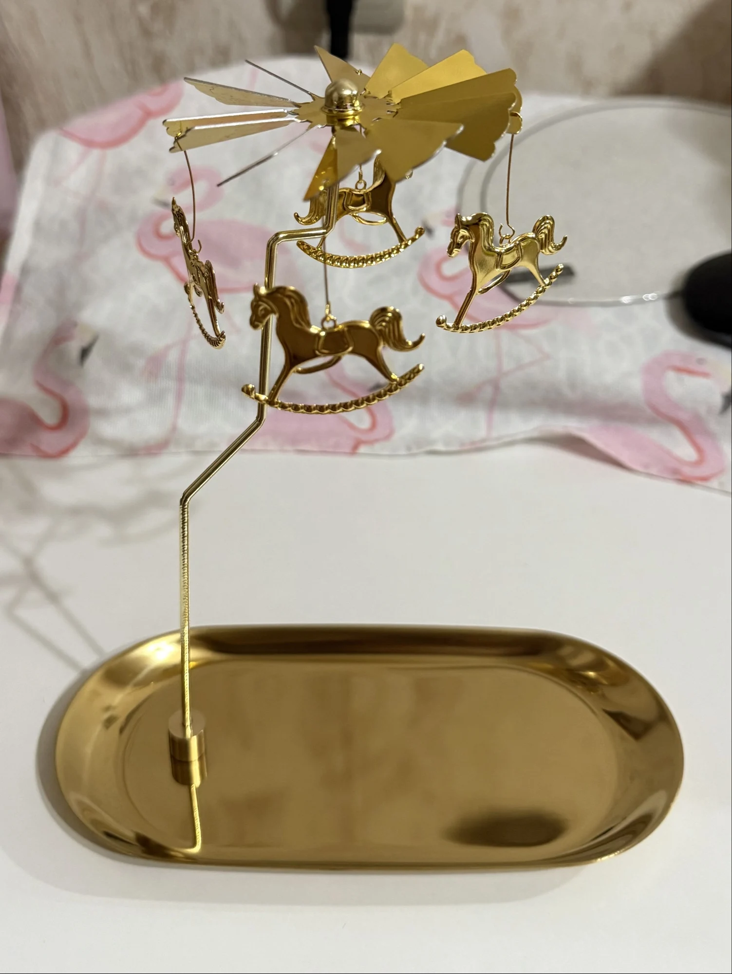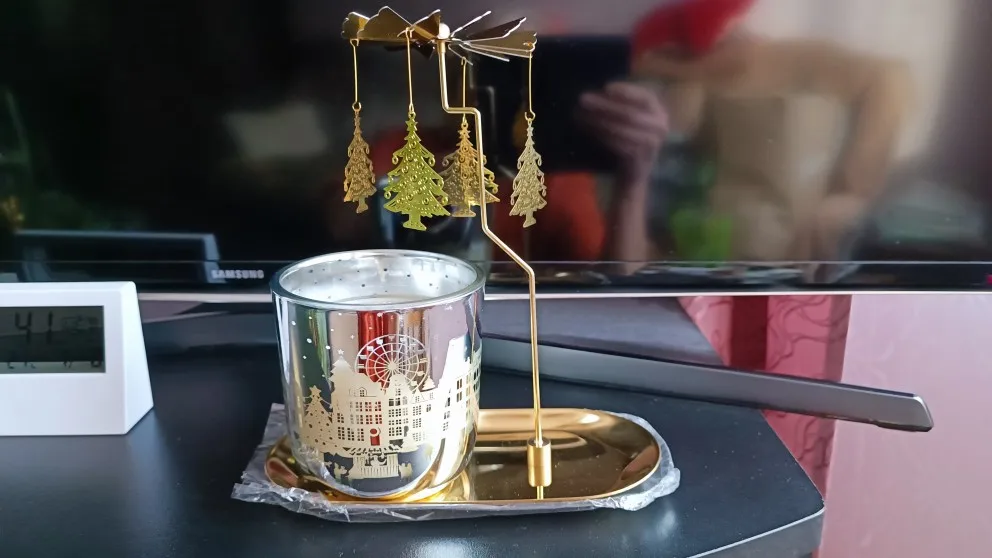 Exactly as described. A gold-plated candle holder looks very beautiful. The carousel spins well when the candle is burning. Since the carousel candle holder does not come with a plate, I ordered it separately. I really like this candle holder. I am very satisfied with this purchase.