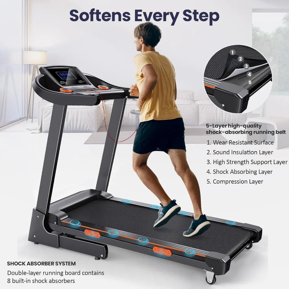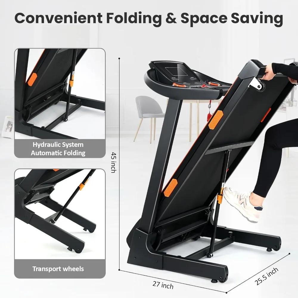 - 3.5HP Quiet Brushless Motor & Hydraulic System: Our newly-upgraded brushless motor produces up to 3.5hp while being quiet, efficient, and easy to maintain. It can provide speeds up to 8.7 mph with low noise levels below 50 dB. And with a sophisticated hydraulic system and transport wheels, this compact and portable treadmill with automatic incline can be easily folded and stored away. Perfect for small spaces and apartments and for both office and home use.