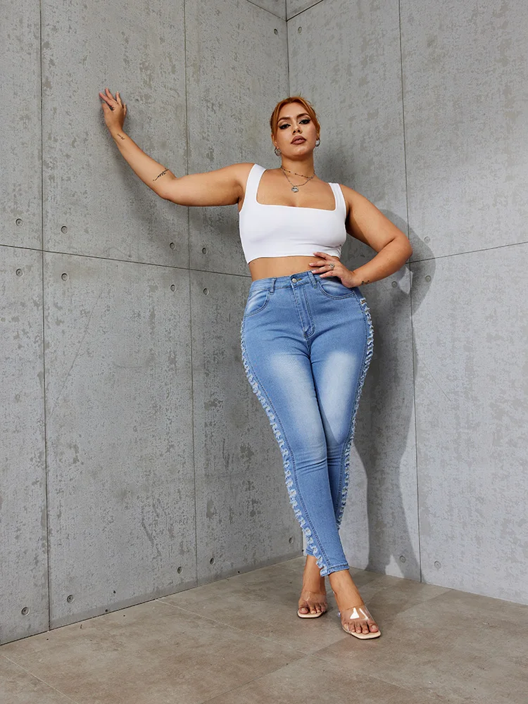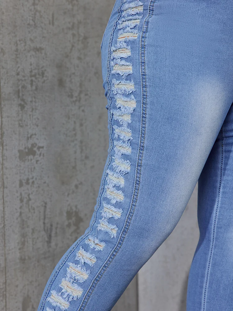 Trendy Holes Jeans Women Casual Comfort Skinny Pencil Pants Classic Blue Mid Waist Plus Size Denim Trousers Worn In All Seasons