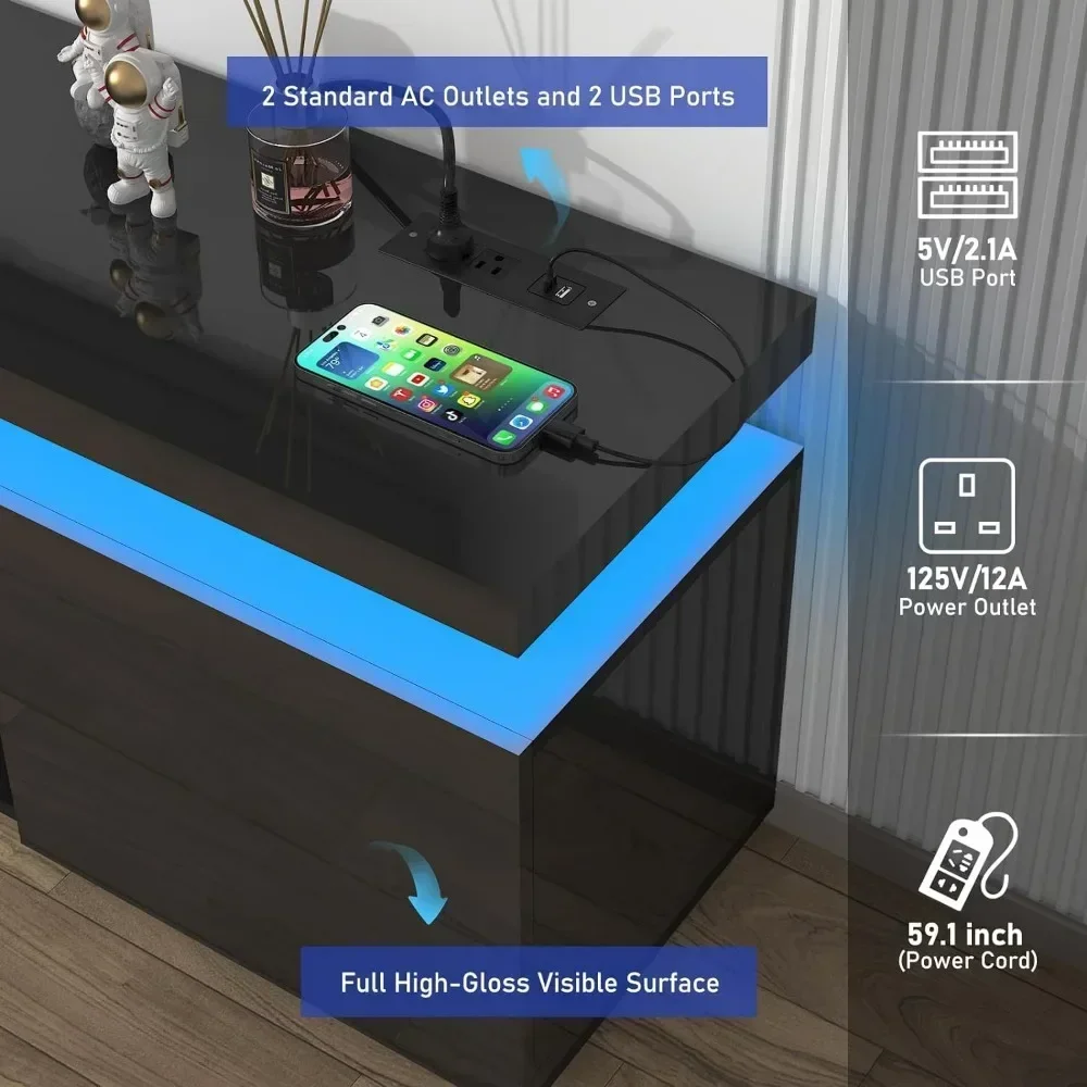 - THOUGHTFULLY DESIGNED LED TV CONSOLE- Visible surface high gloss TV cabinet adds a modern and technological touch to your home. 2 large capacity cabinets and 3 open compartments perfect display PS5, Switch, soundbox, back wire holes allow for easy cable management keep your living room clean away from any clutter.