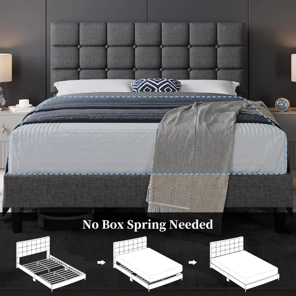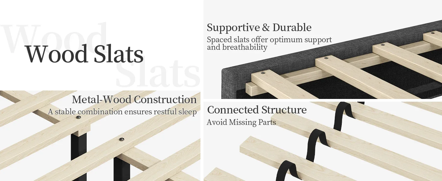 No Box Spring Needed: Require no bulky box spring or any other extra foundation. After assembling the upholstered bed frame with adjustable headboard, just put your latex, foam or spring mattress on the wooden slats, and everything is all set.
