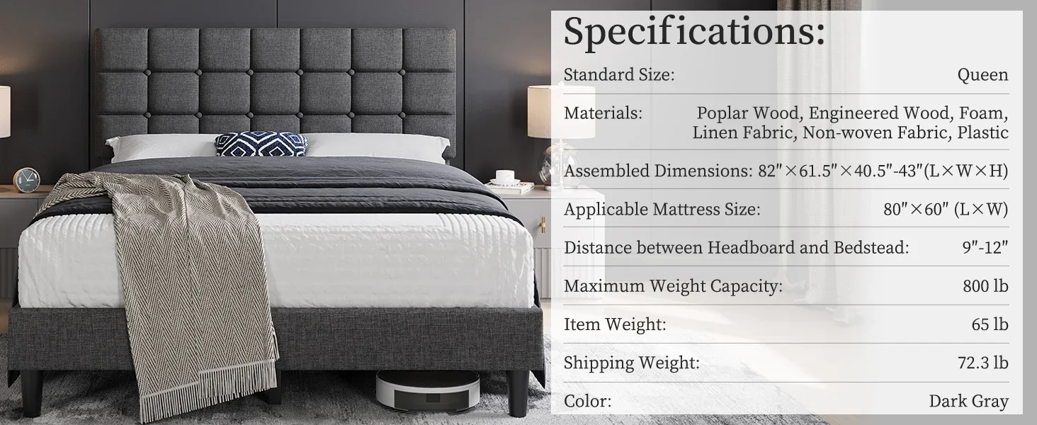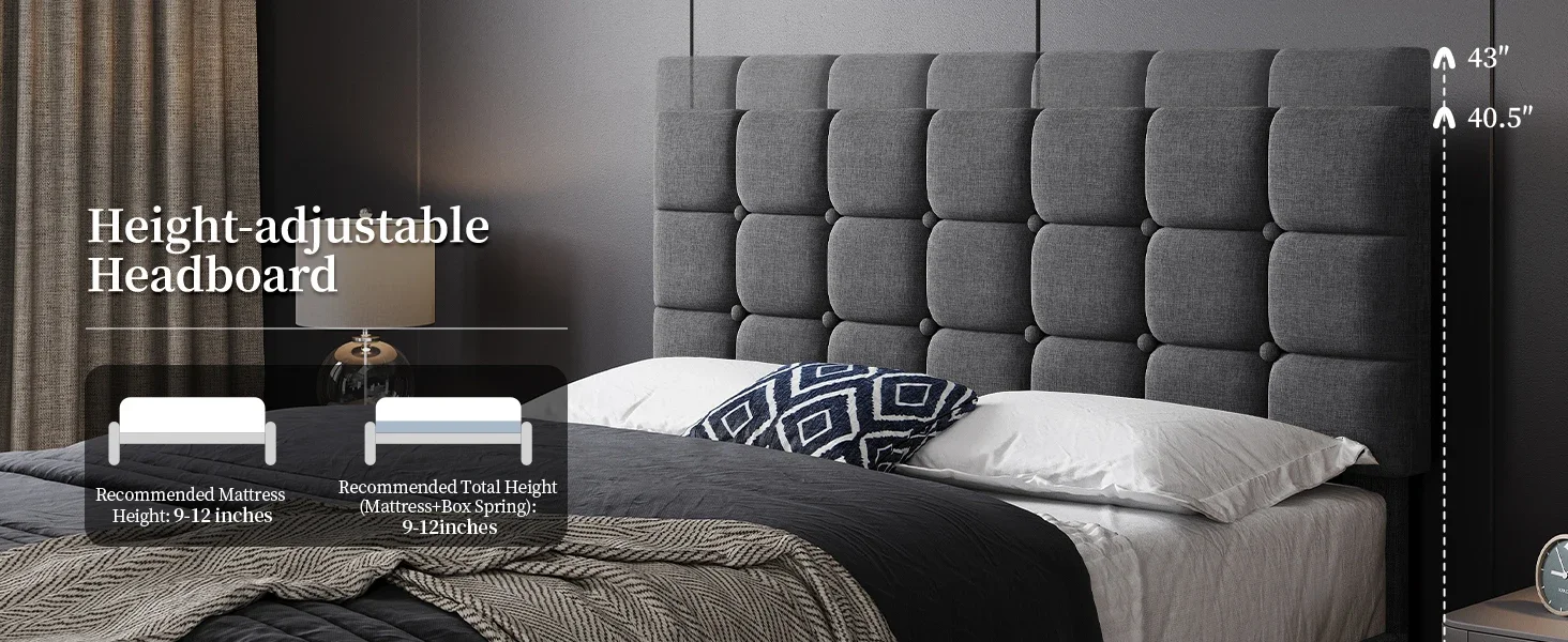 Height-Adjustable Headboard: The headboard of the queen upholstered bed frame can be adjusted at two heights (41″ and 43″), and you can adapt it to the optimal height for your needs.