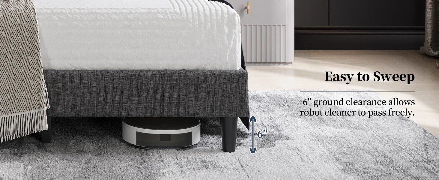 Clean With Ease: 6″ Ground clearance for future dust cleaning. Cleaning robots can pass through freely, making cleaning this upholstered platform bed a breeze for you.