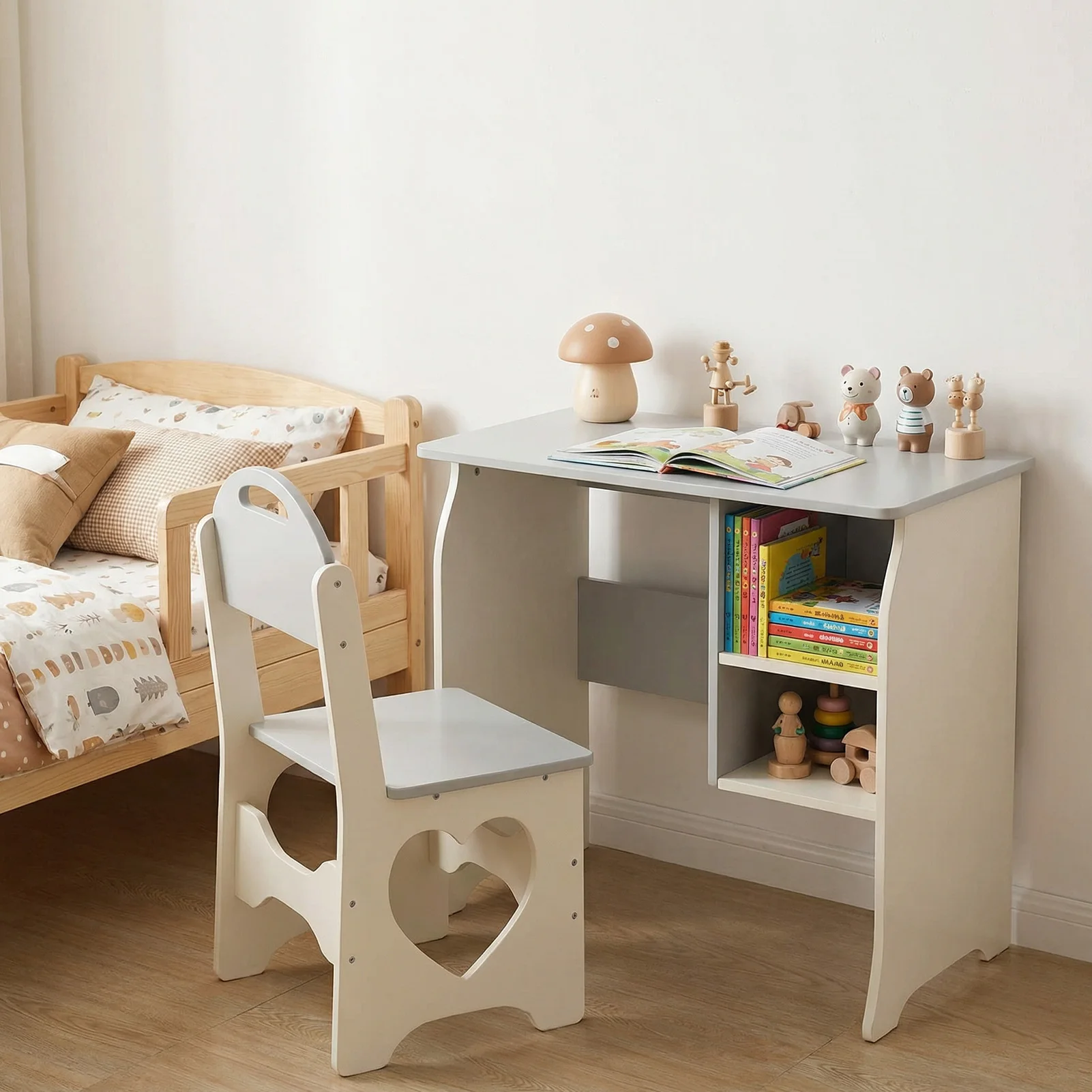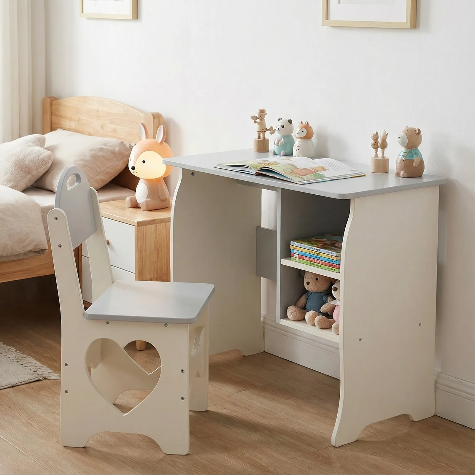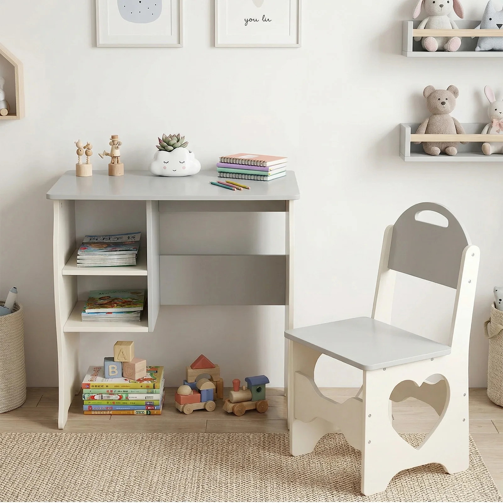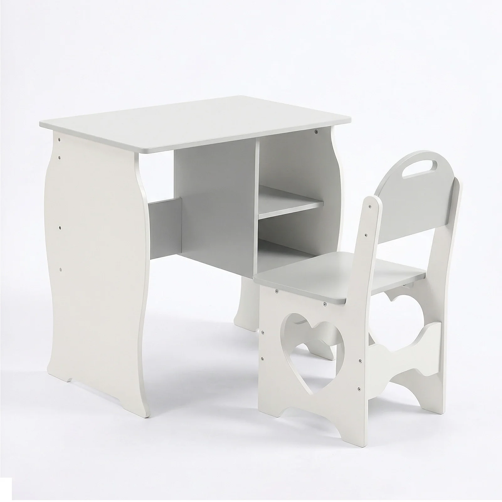 3. Stylish Aesthetic: The trendy white and gray color scheme complements various home styles. With a charming cat pattern on the table and unique heart cut designs on the chairs, this set adds a touch of fashionable flair to any child’s room.