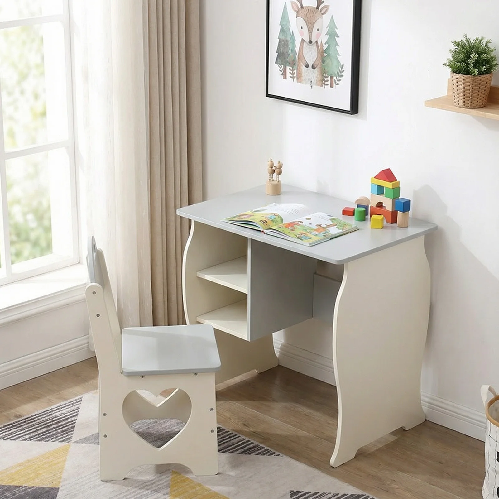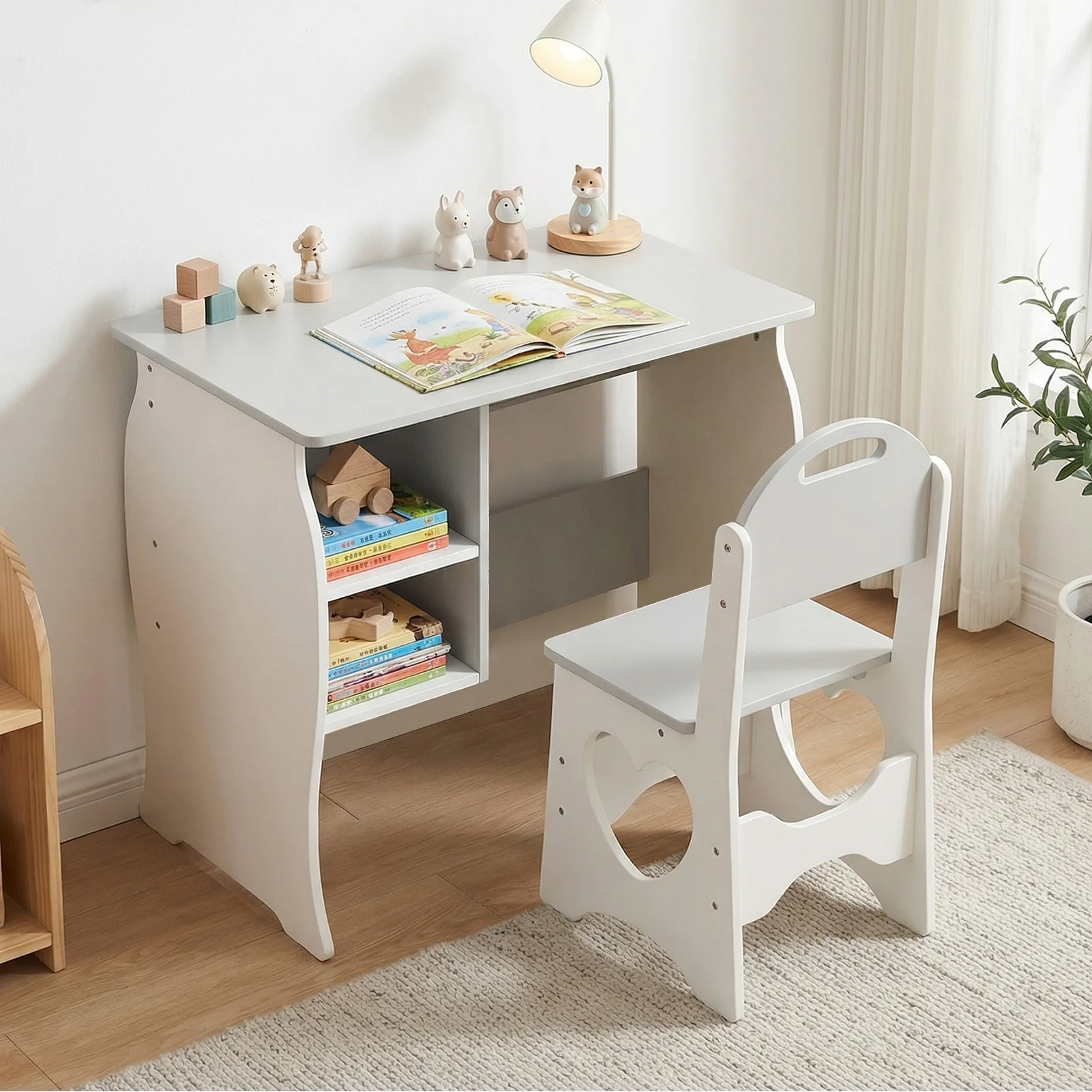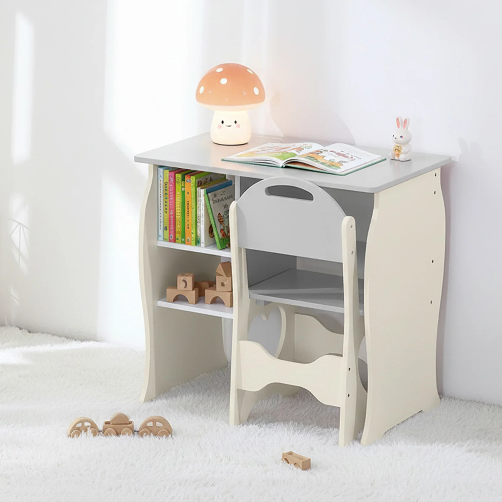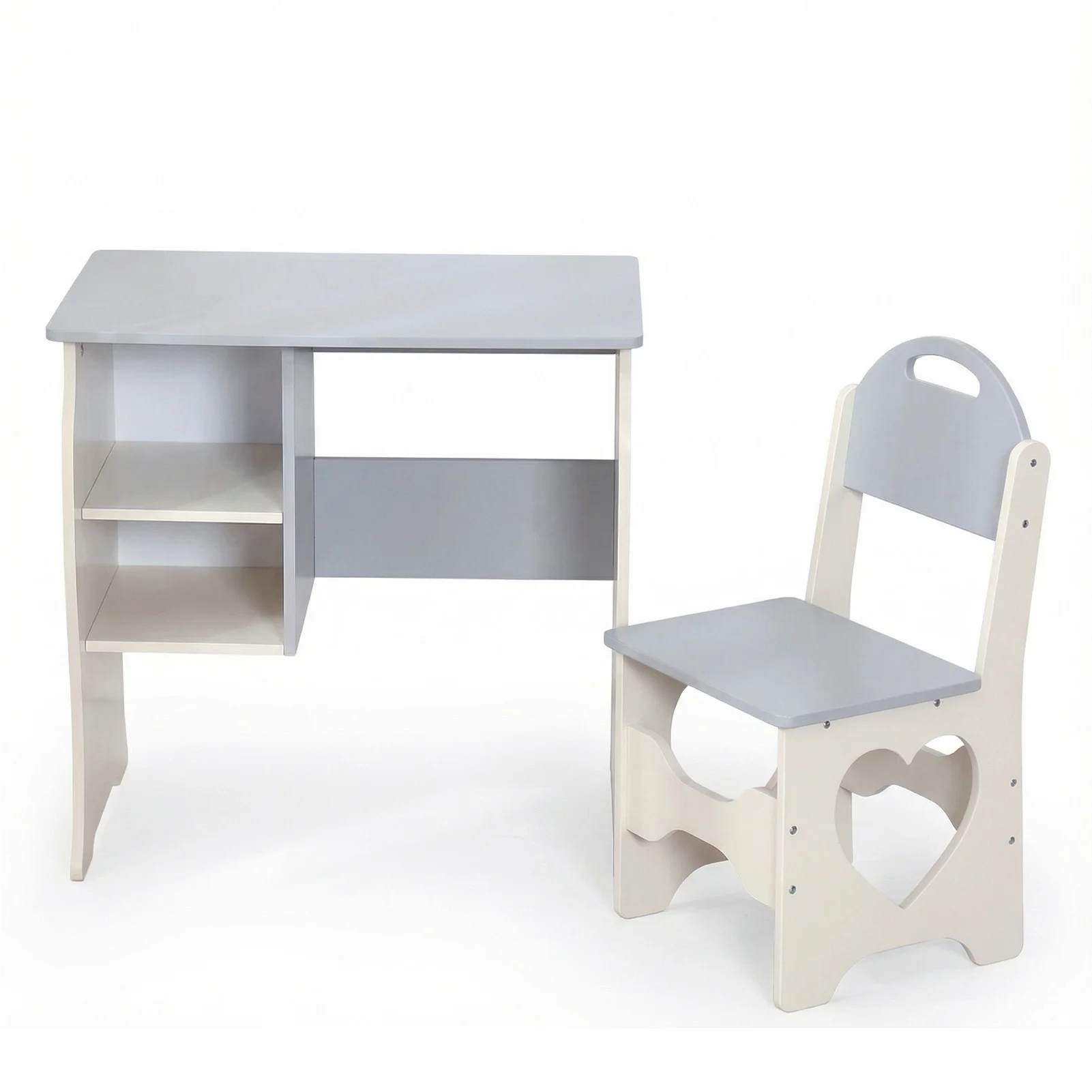 Kids Desk and Chair Set Multifunctional White and Grey Toddler Student Writing Table Set for Home School: