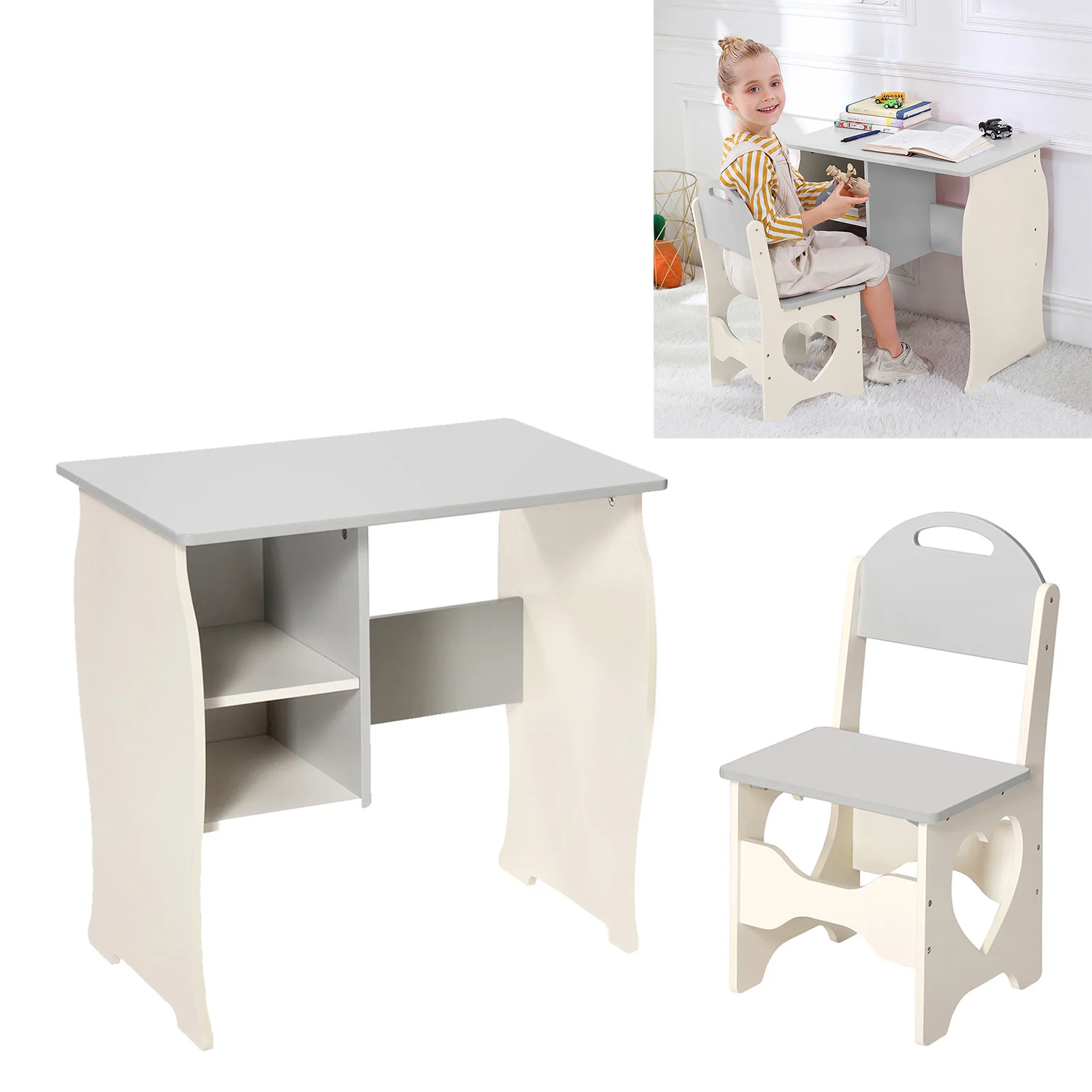 US Kids Desk and Chair Set Multifunctional White and Grey Toddler Student Writing Table Set for Home School