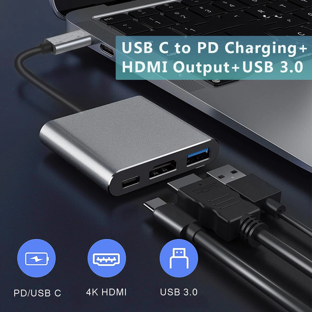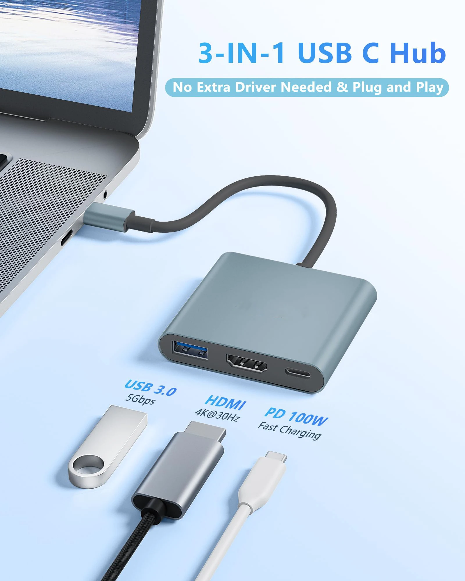 1.Type-c 3-in-1 expansion, plug and play multi-port same connection, support laptop/tablet/cell phone expansion.