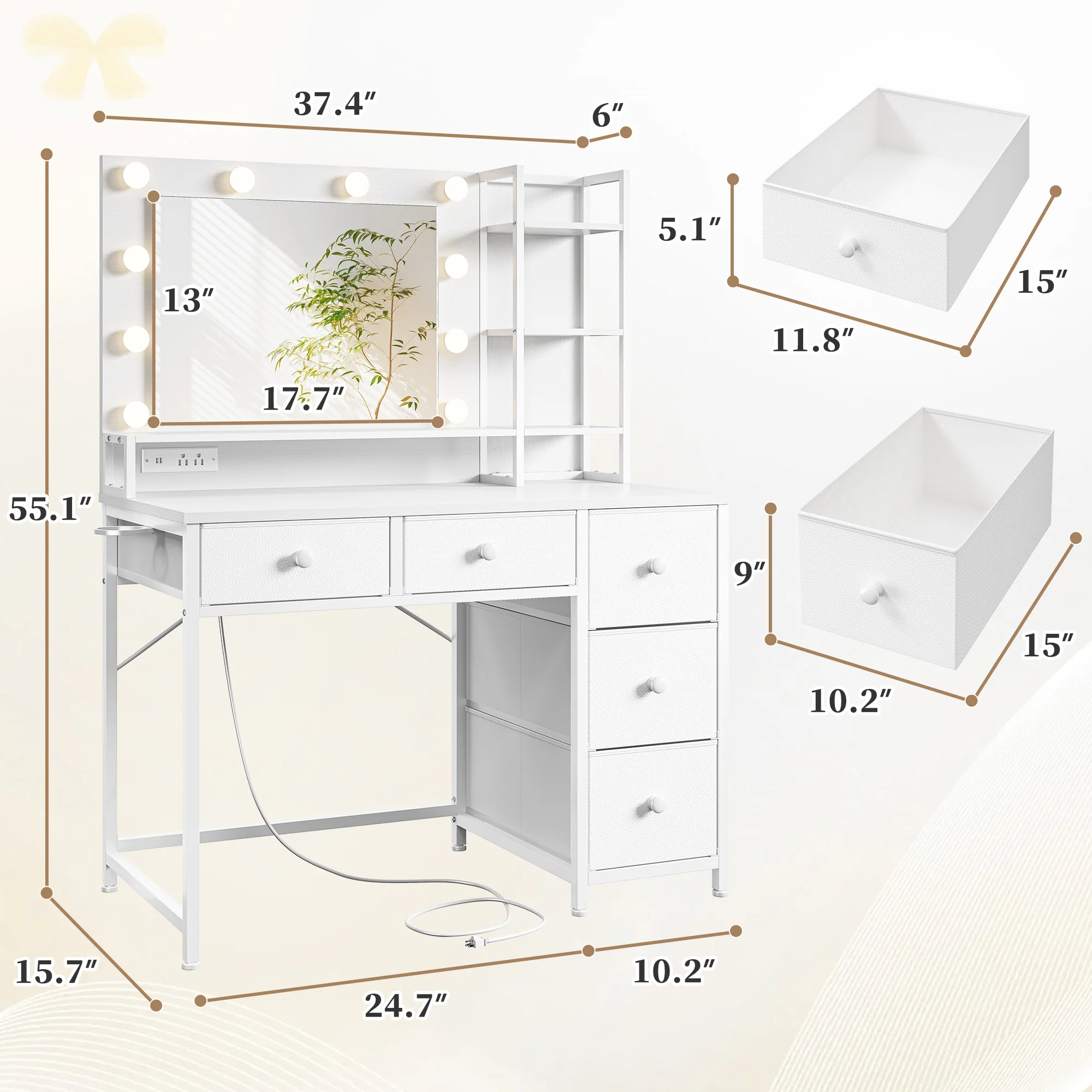 Be the first to review “Vanity Desk with LED Lighted Mirror & Charging Staion 5 Fabric Drawers Makeup Vanity Table for Bedroom Dorm”