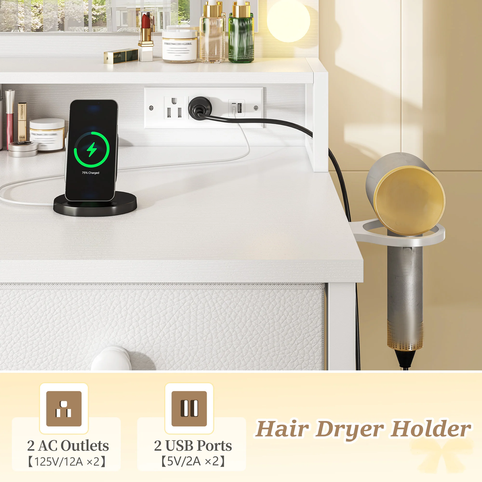 Modern vanity with built-in power strip & reversible hair dryer rack (left/right install) for easy access. Sturdy metal frame ensures strong support, stability & durability, matching various home decors.