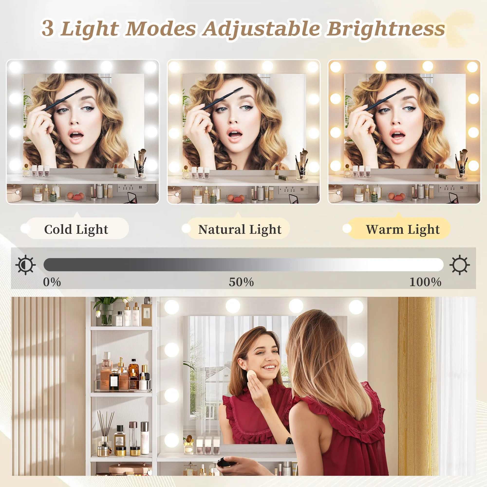 This vanity desk features a LED-lit mirror with 3 light modes (warm/natural/cold). Freely adjust brightness for precise makeup, hairstyling or photo-taking. Perfect space saving dressing table for bedroom, dorm, small apartment & dressing corner, upgrading your daily beauty routine.