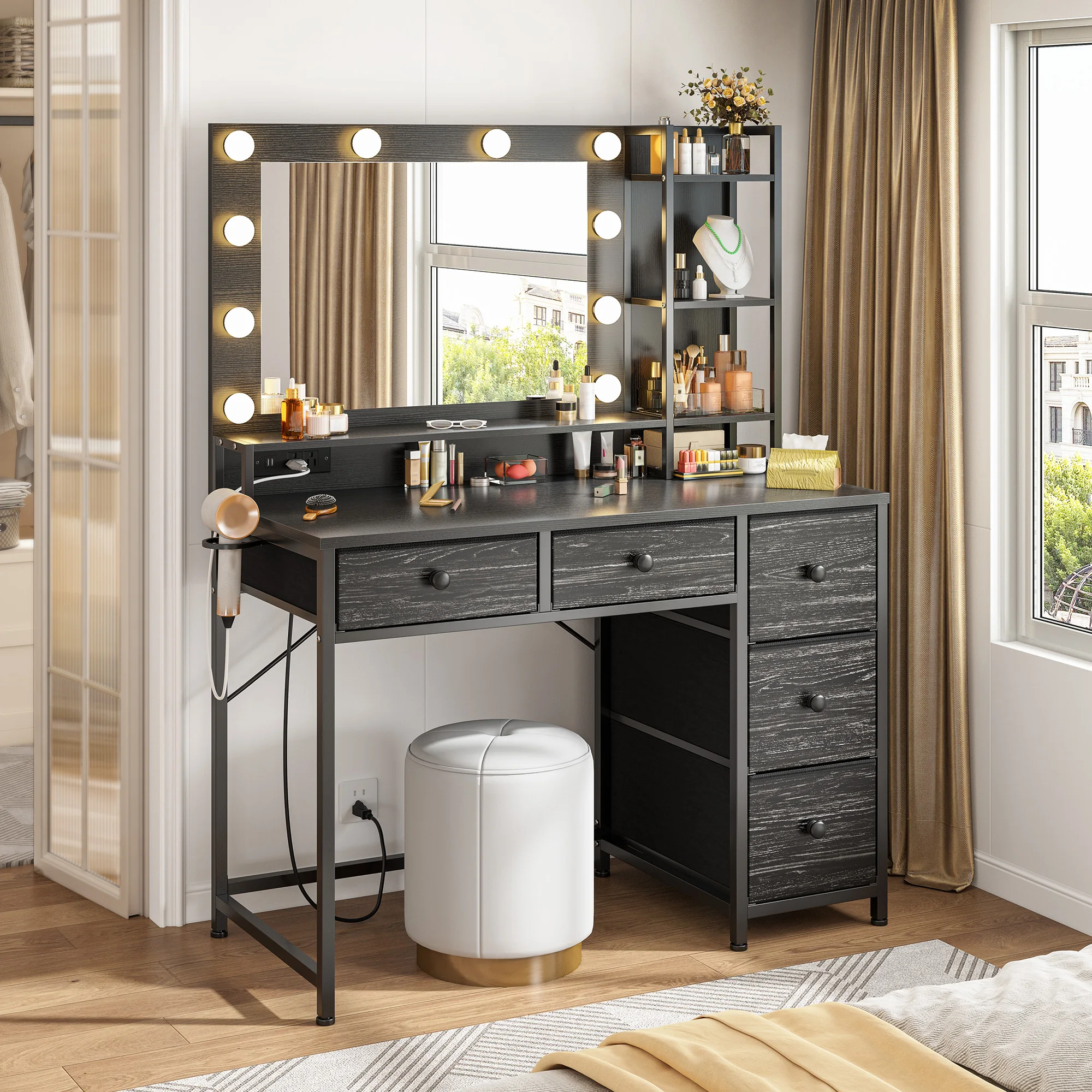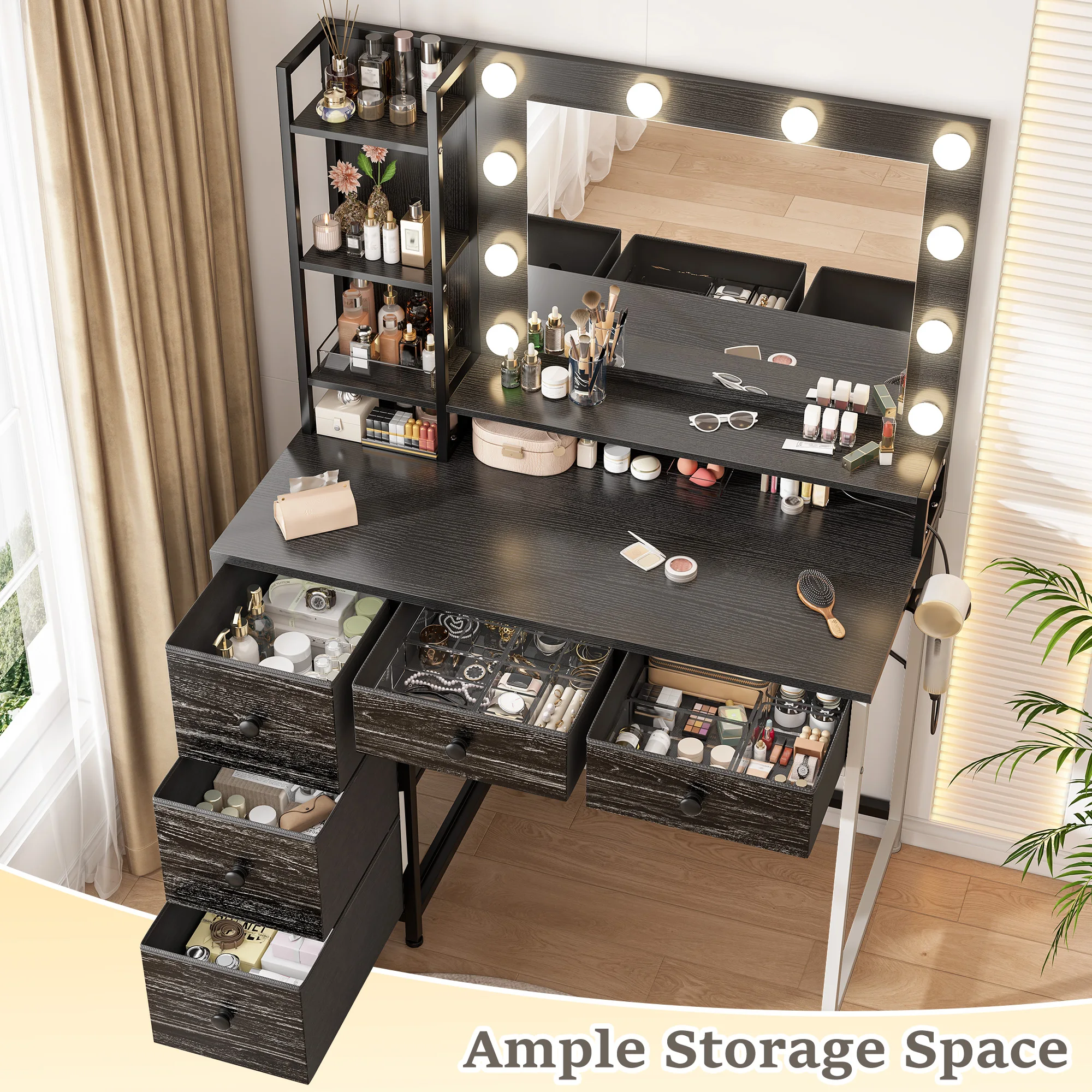 Spacious desktop + 6 open shelves + 5 deep drawers provide ample storage for all beauty essentials. Easily organizes cosmetics, hair straightener, blow dryer, makeup brushes & more, keeping your dressing area tidy.