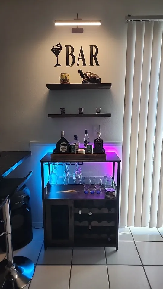 🍷 Flexible Storage Solution – Holds up to 12 bottles in removable racks, with glass holders, adjustable shelves, and ventilated cabinet for organized wine, spirits, or coffee essentials.