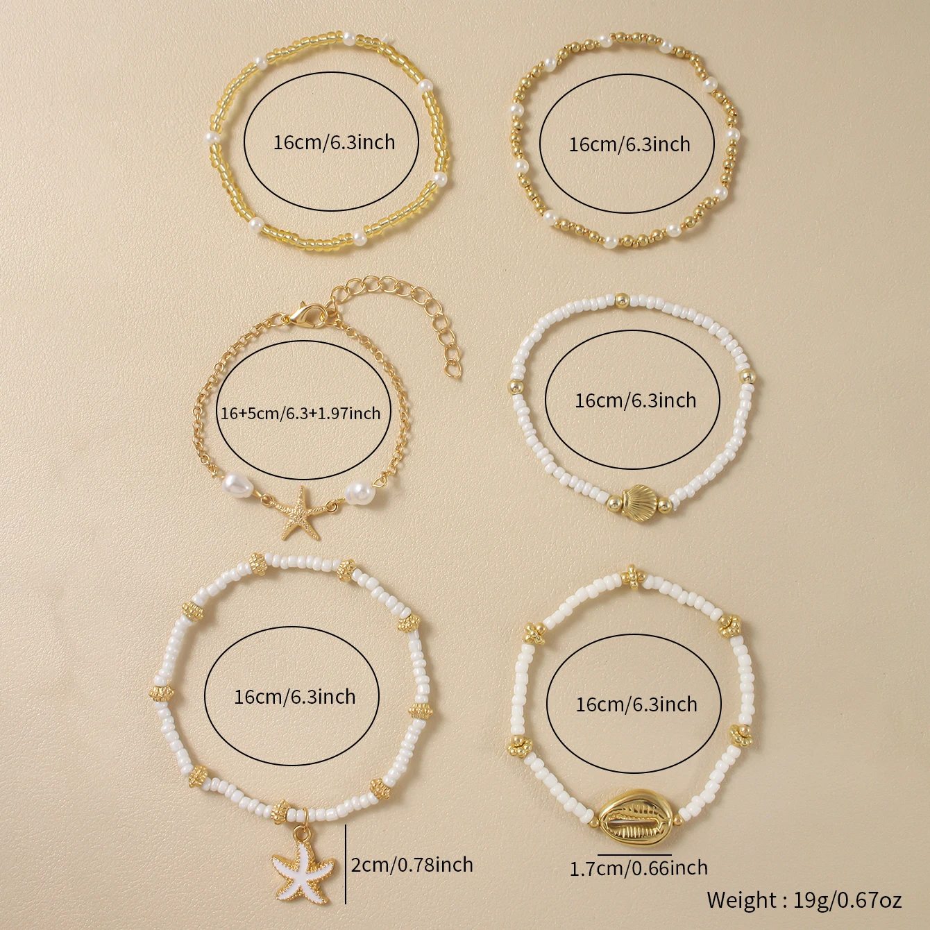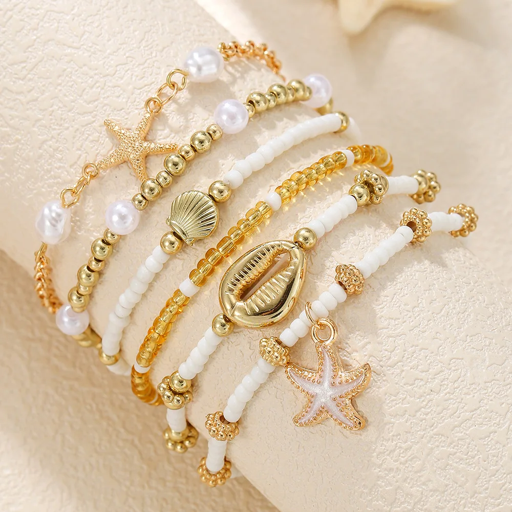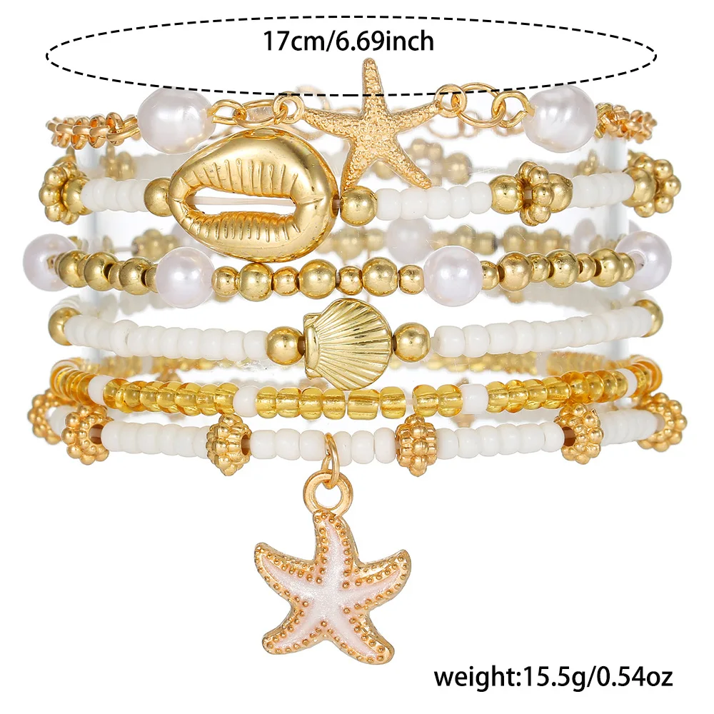 Vintage Seed Bead Stacked Bracelet Set Starfish Shell Embellishment Bracelets Elegant Women’s Summer Beach Party Ideal Jewelry