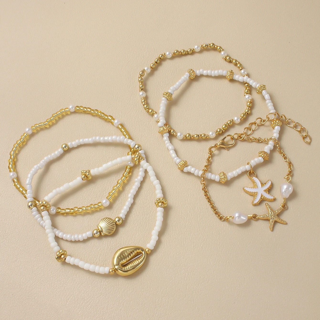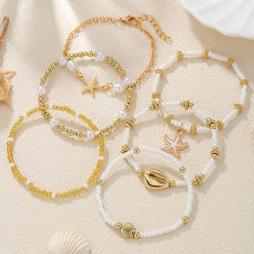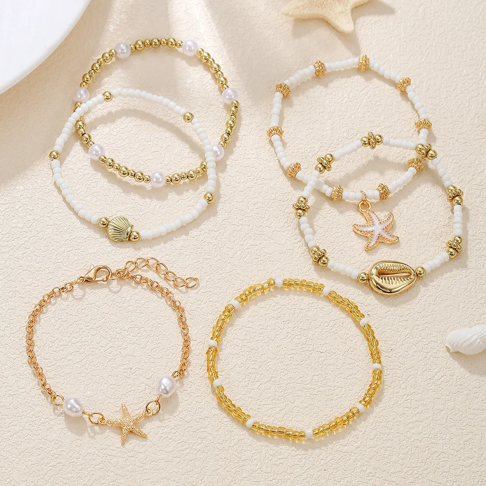 Vintage Seed Bead Stacked Bracelet Set Starfish Shell Embellishment Bracelets Elegant Women’s Summer Beach Party Ideal Jewelry
