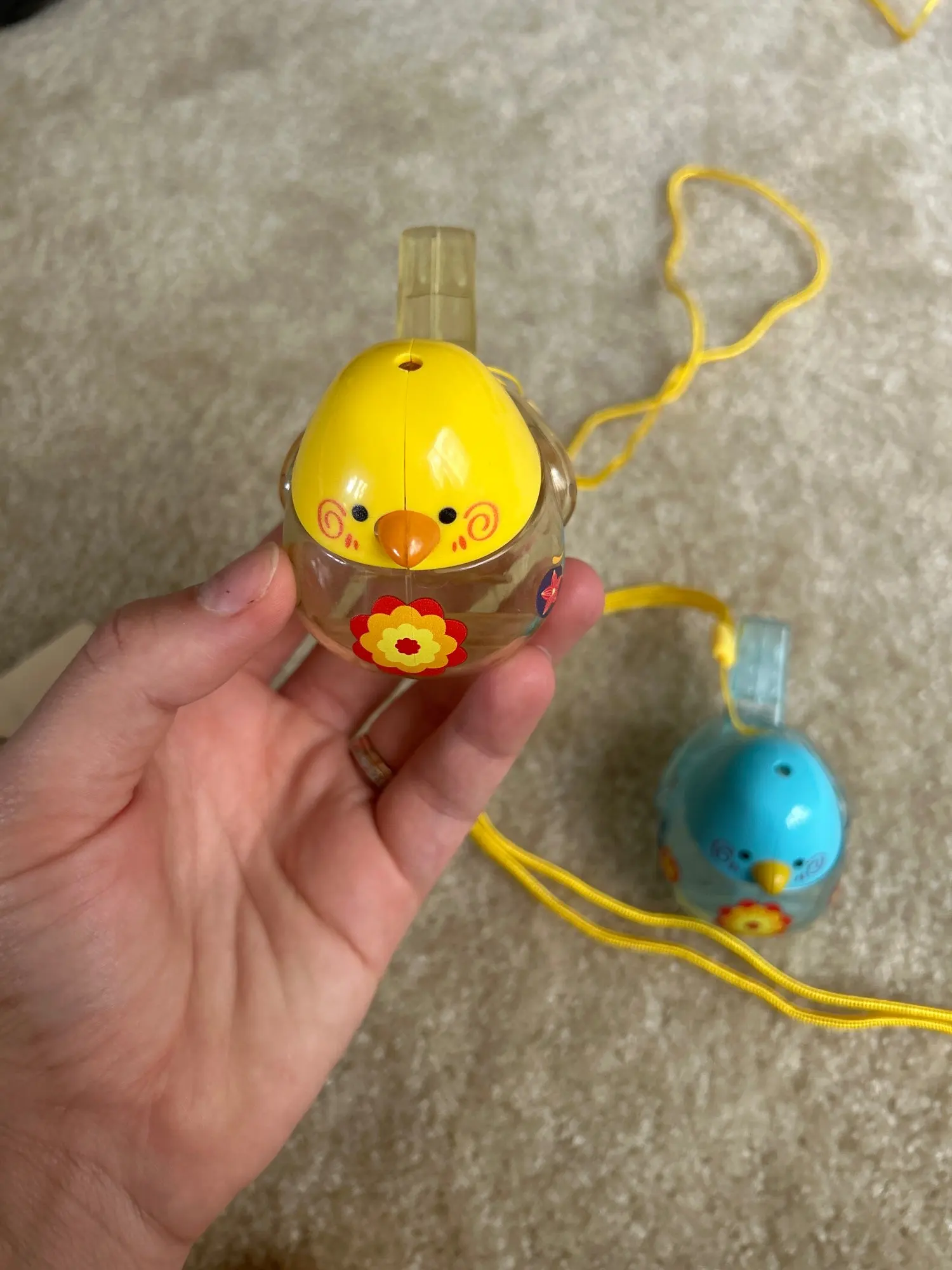Nice toy for kids, whistle filled with water makes really great sound like a tweeting bird.