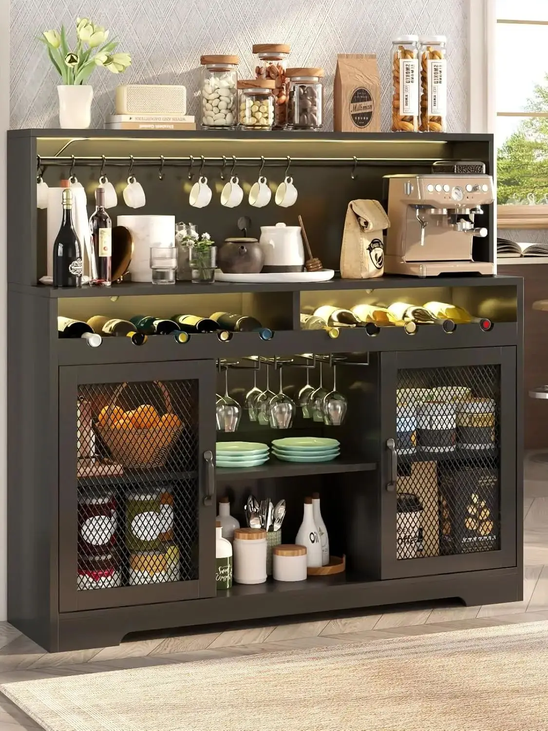 Spacious storage with wine rack, mesh doors, open cubbies and glass holders for full organization.