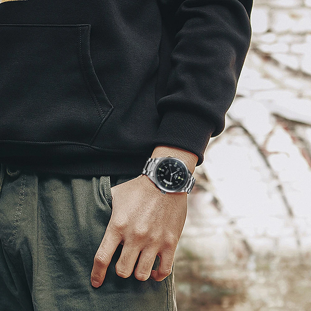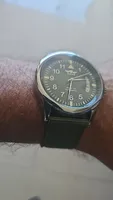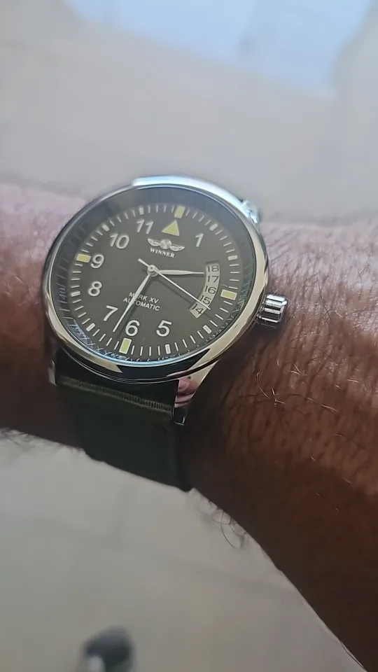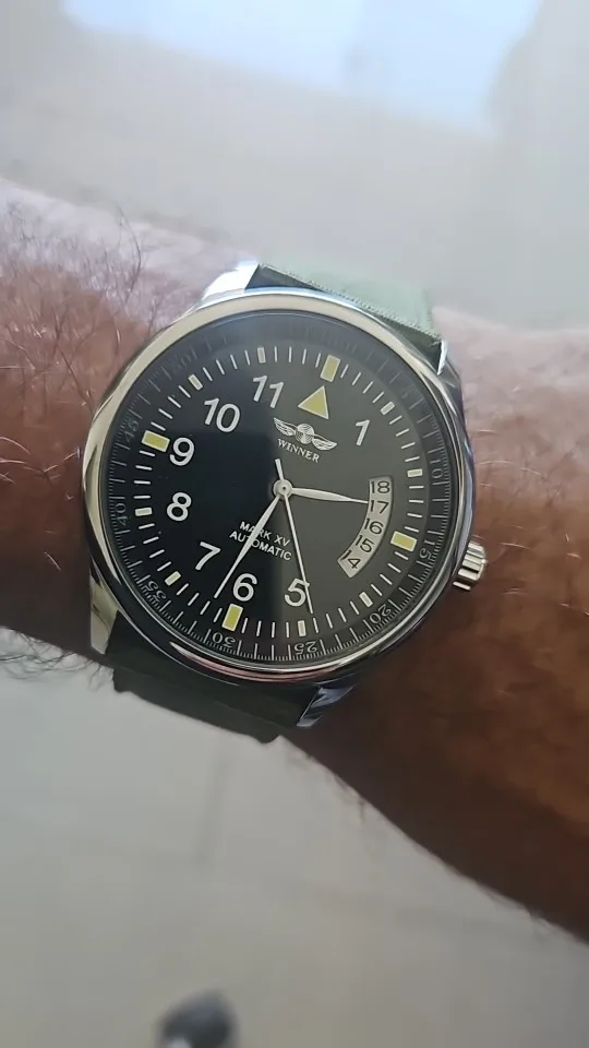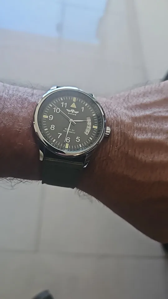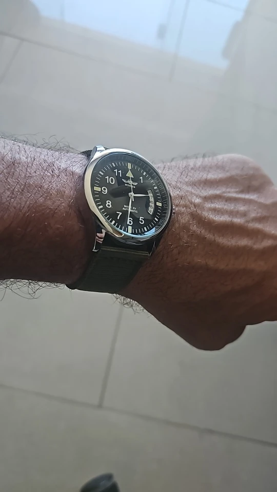 I really liked it. Here with a green nato strap and a steel strap, both purchased separately. It has good weight and the curved glass looks great. I’ve read that the automatic mechanism is actually an adaptation of a previous one that was originally mechanical, and that’s why sometimes it can fail, but if you wind it up, it works just the same. For the price, it’s fantastic.