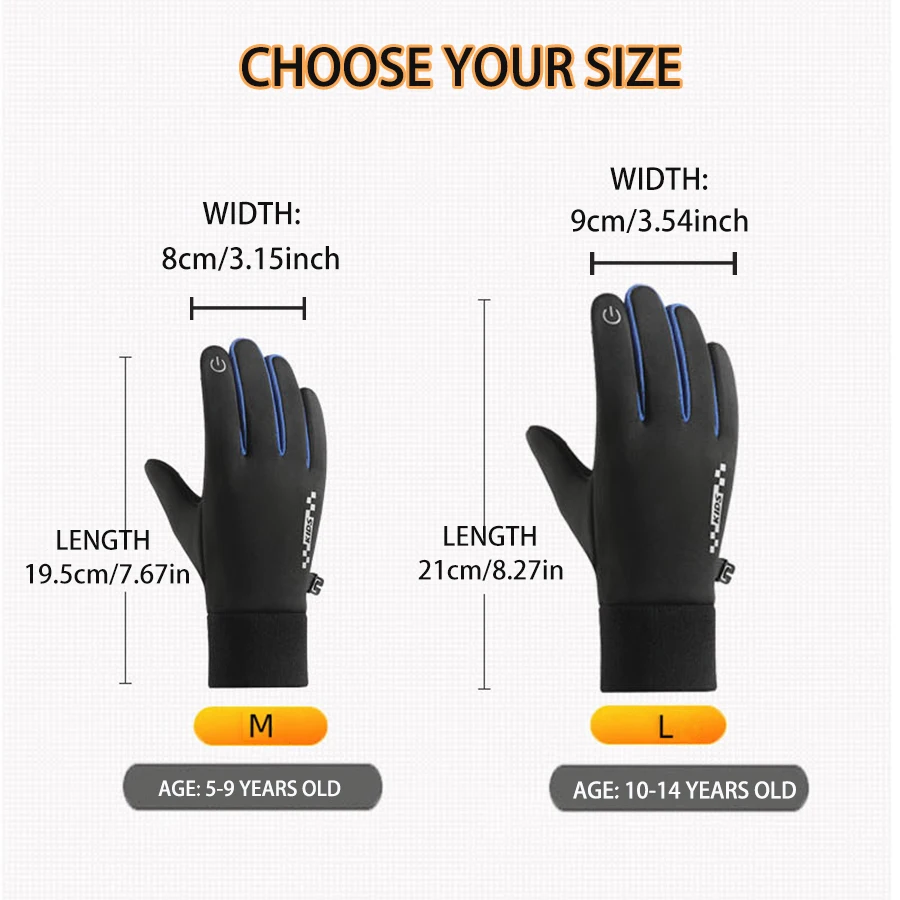 Size: The thermal cycling gloves are suitable for boys and girls, available in M size (7.67×3.15 in) and L size (8.27×3.54 in). the kids sports gloves are connected by a buckle, not easy to lose.