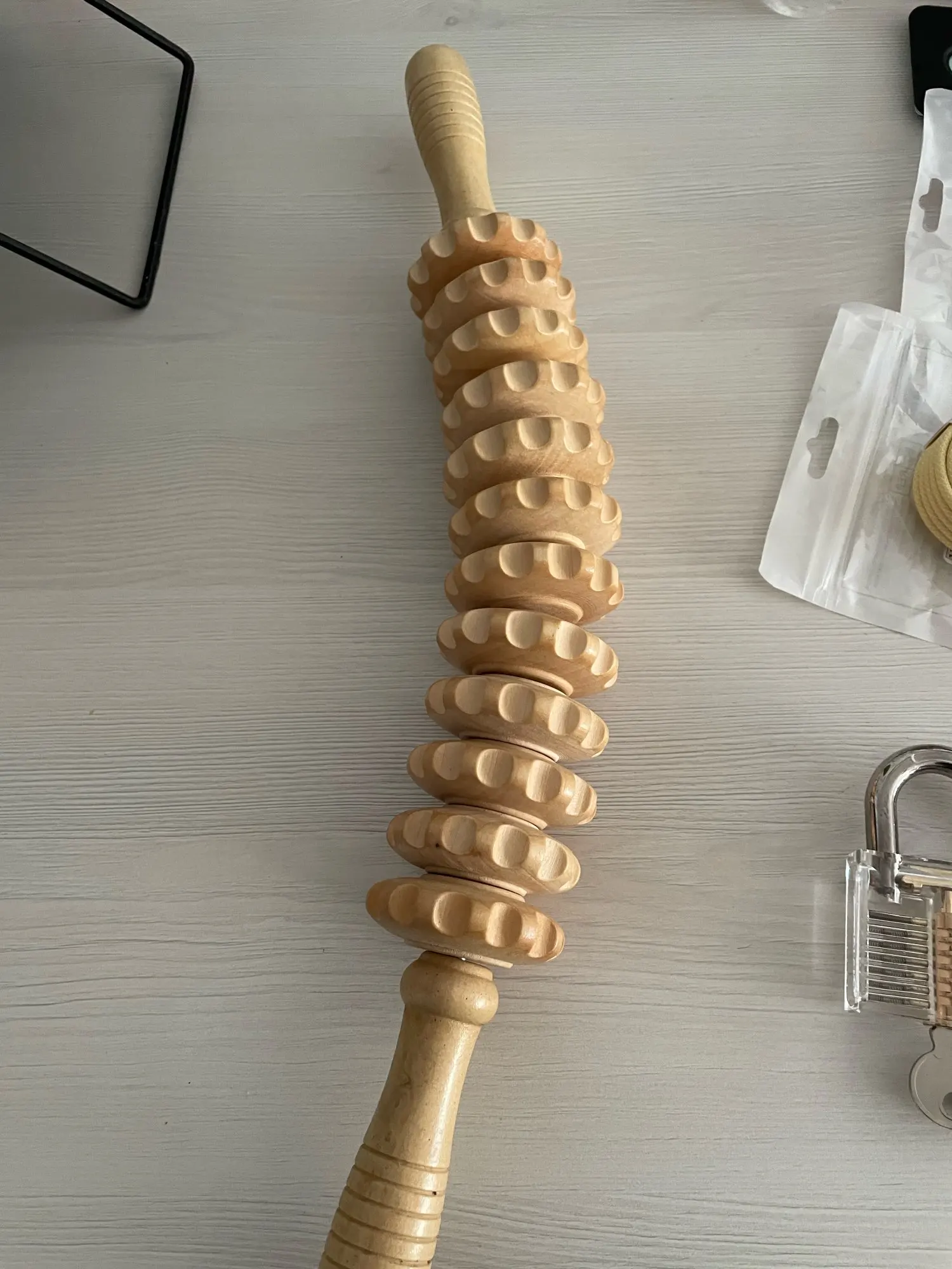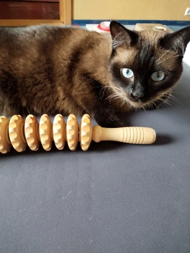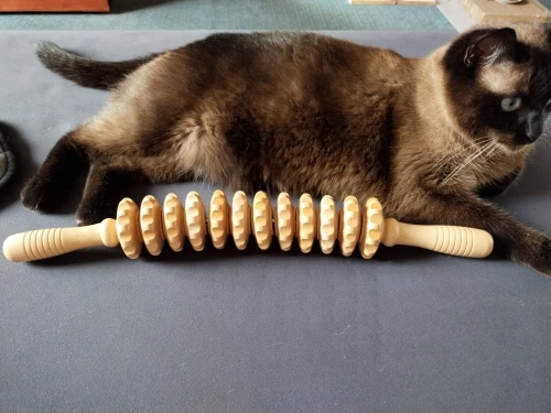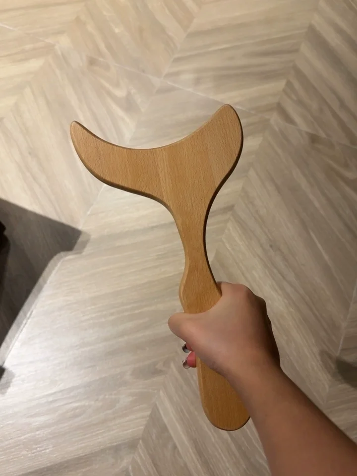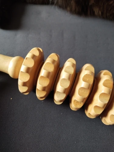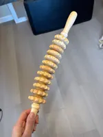 A large, beautiful, and comfortable massager, curved, with a pleasant wood scent. The wooden wheels spin and provide a pleasant massage.