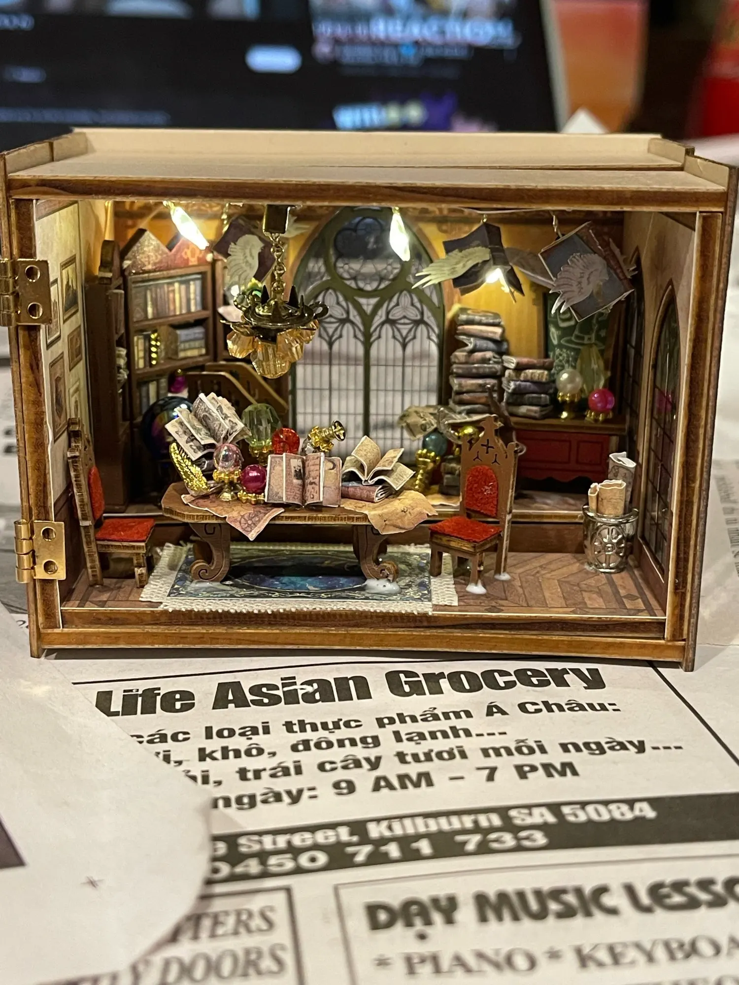 Completed product is very pretty. The lighting wires are a bit fragile so one of them had snapped off but everything else was great otherwise.