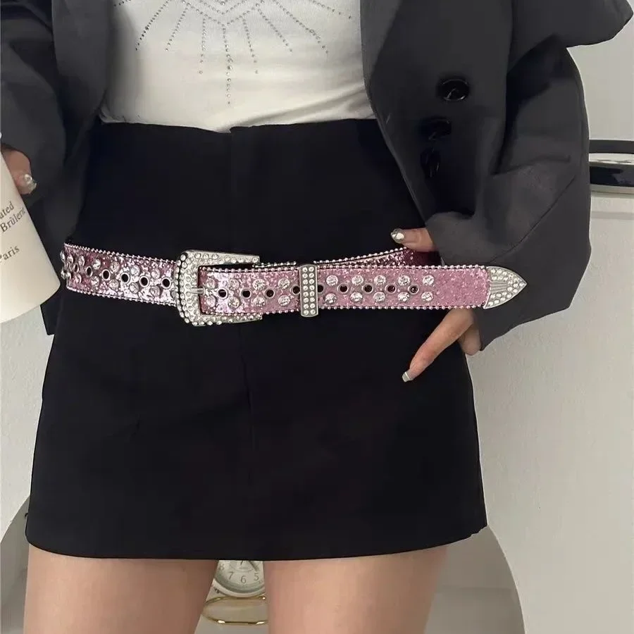 Y2K Women Fashion Solid Print Studded Full Rhinestone Belt PU Leather Bling Crystal Adjustable Glitter Waistband for Club Party