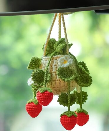 Car Plant Crochet Hanging Basket, Plant Strawberry Hanging Plant for Car Decor, Car Ornaments Charms for Rear View Mirror