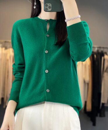 100% Merino Wool Sweater Women O-Neck Cardigan Basic Style Buttoned Knitwear Female Casual Autumn Winter Soft Tops