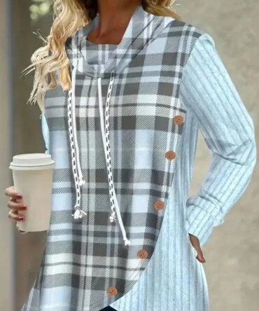 Women Plus Size 1XL-5XL Casual Hoodie Sweatshirt Pullover Women’s Colorblock Plaid Print Long Sleeve Drawstring Hoodie