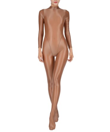 Women Glossy Full Body Jumpsuit Gym Yoga Tights Rompers Mock Neck Long Sleeve Footed One Piece Jumpsuit Clubwear Sportwear
