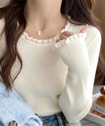 2025 Knitted Ruffles O-neck Long Sleeve Slim Jumper Autumn Winter Women Sweater Fashion Solid Ladies Casual Soft Pullovers