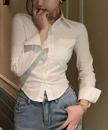 2025 Spring Commuter Long Sleeve New Female Crop Tops Korean White Office Women Chiffon Shirt Pocket Button Lapel Ladies Blouse