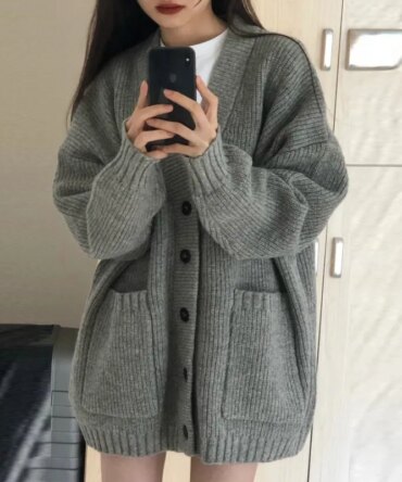 Autumn and Winter New Fashion Woman Sweater Gray Soft Knitted Sweater Top Casual and Versatile Button-up Cardigan Jacket
